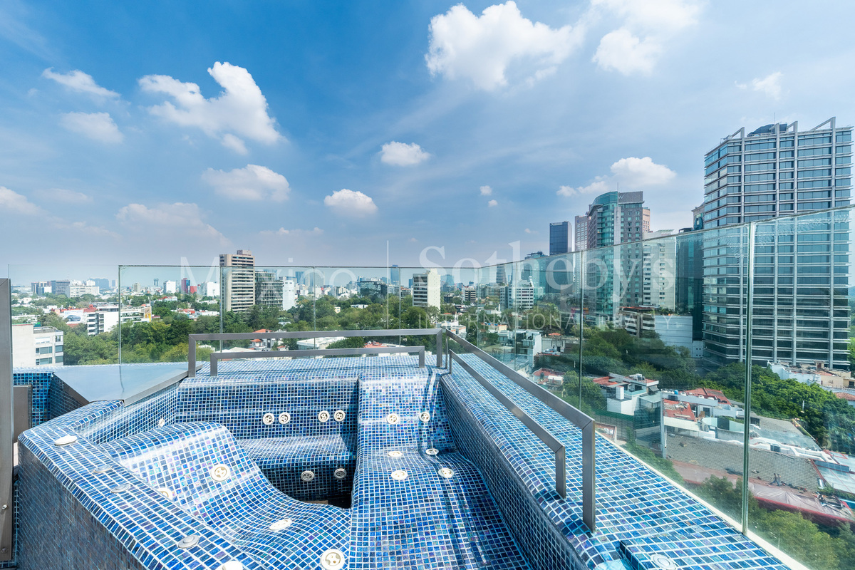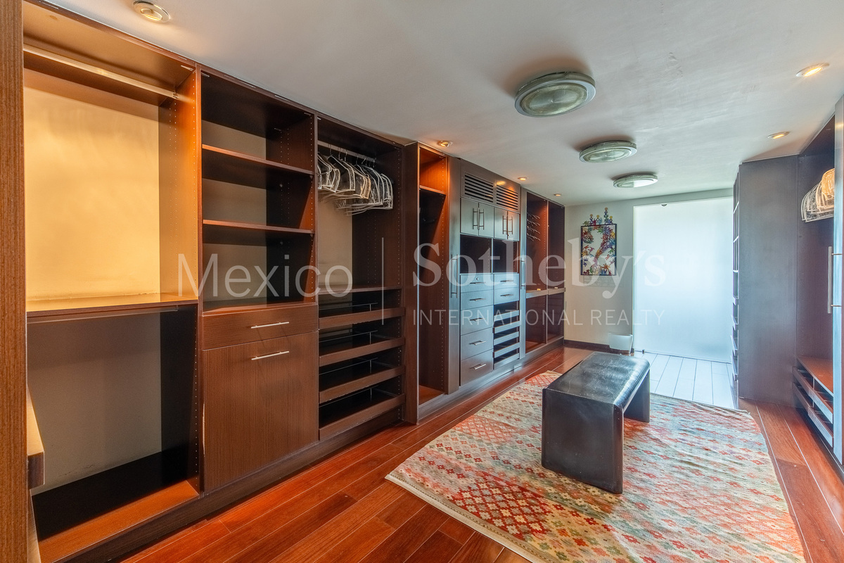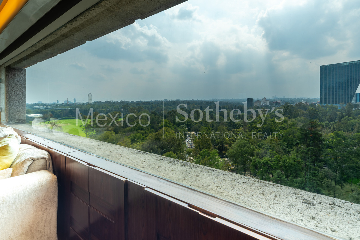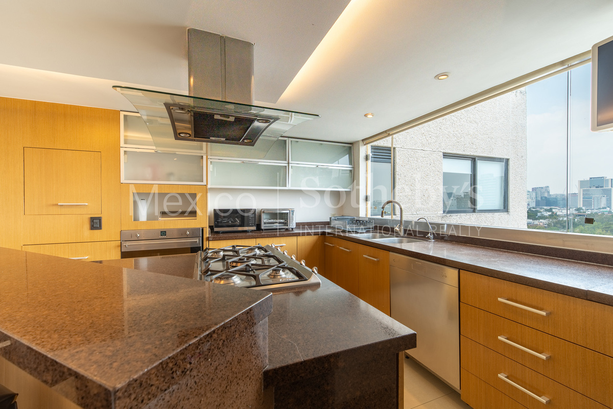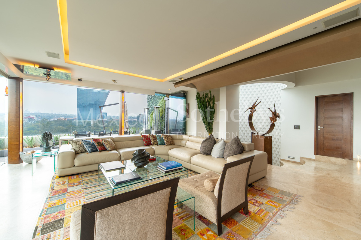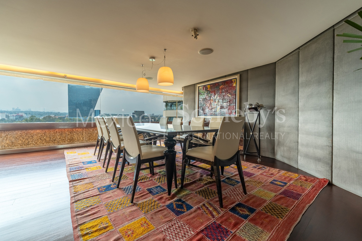 La propiedad cuenta con las mejores vistas panorámicas de la Ciudad de México, que se disfrutan desde sus terrazas integradas al área social, ideales para comidas y reuniones con familia y amigos. La luz natural inunda cada espacio, destacando los elegantes pisos de mármol y madera que aportan calidez y sofisticación.
