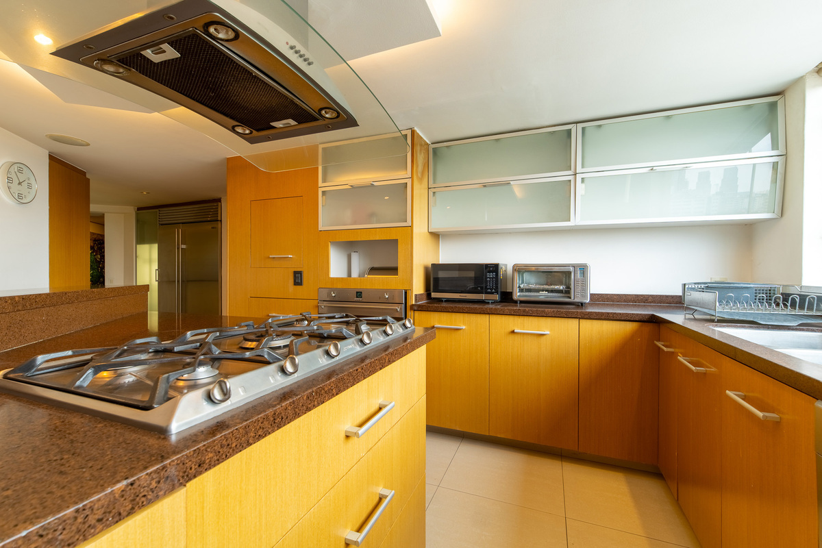 El Penthouse se entrega amueblado y listo para habitar, con una cocina totalmente equipada y mini elevador de servicio para facilitar la atención en eventos. Incluye además un cuarto de pintura o estudio y un espacio de oficina.
