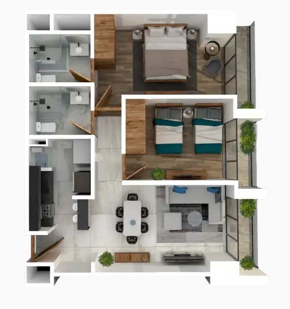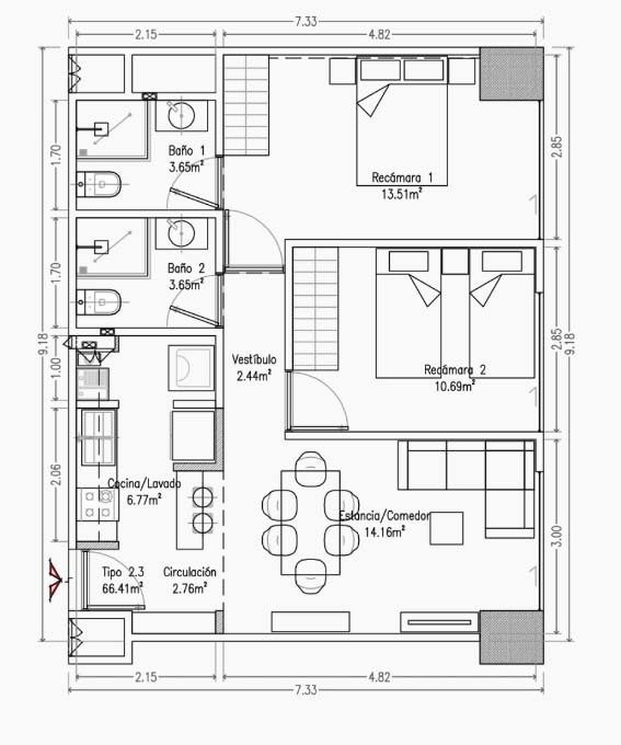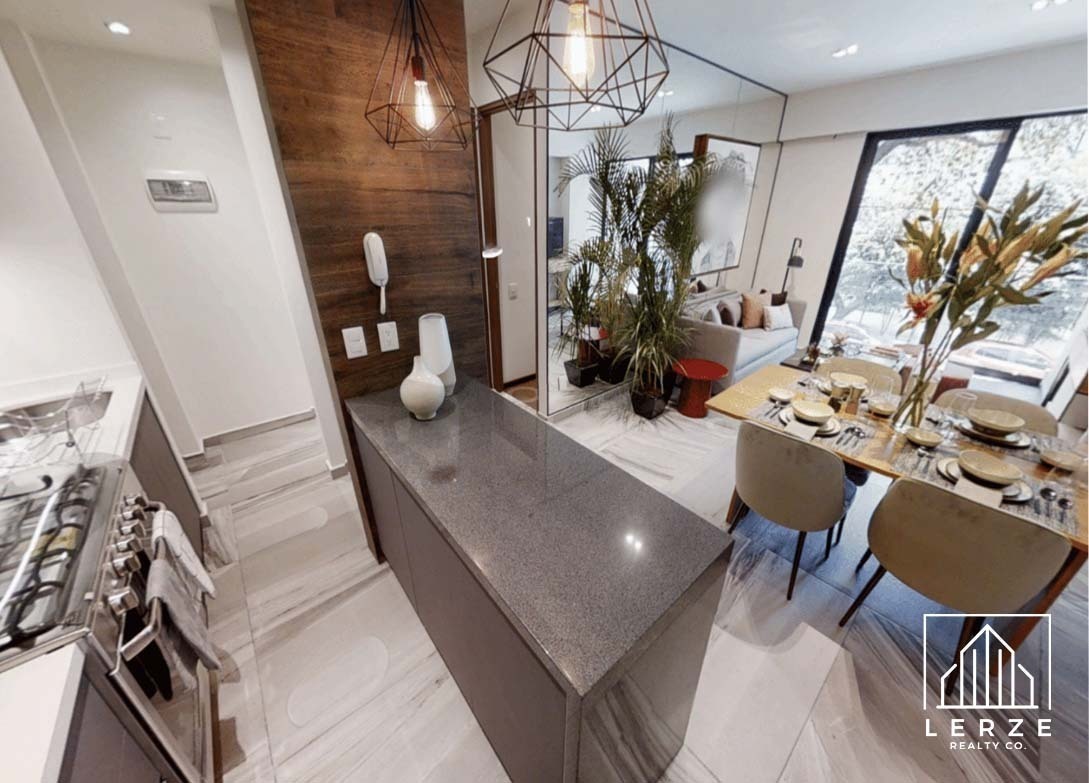 Con un total de 74.97 m², de los cuales 66.41 m² son habitables y 8.56 m² corresponden a un balcón, este penthouse en el séptimo piso cuenta con dos recámaras, dos baños, cocina, comedor, sala y cuarto de lavado.