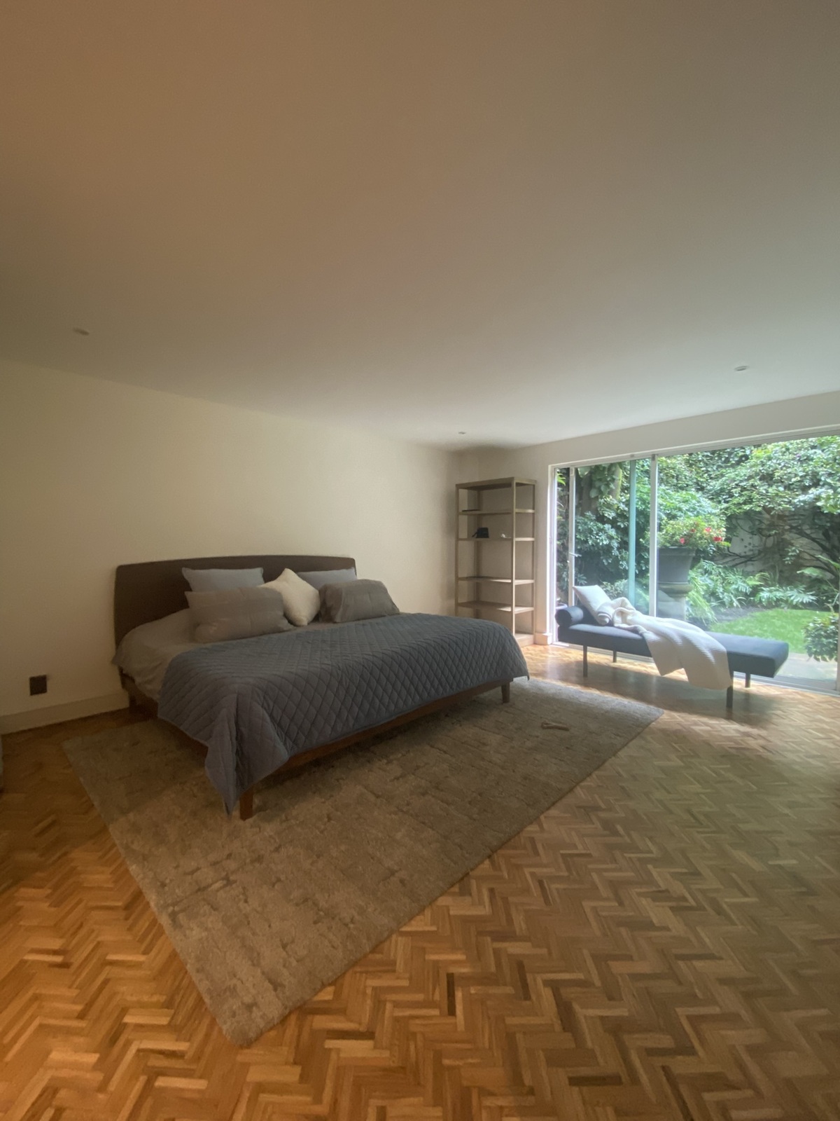 Recámara principal con walk-in closet y baño, segunda recámara con closet. Las dos recámaras y toda el área social, tienen acceso a un espectacular jardín con una terraza y rodeado de árboles y plantas.