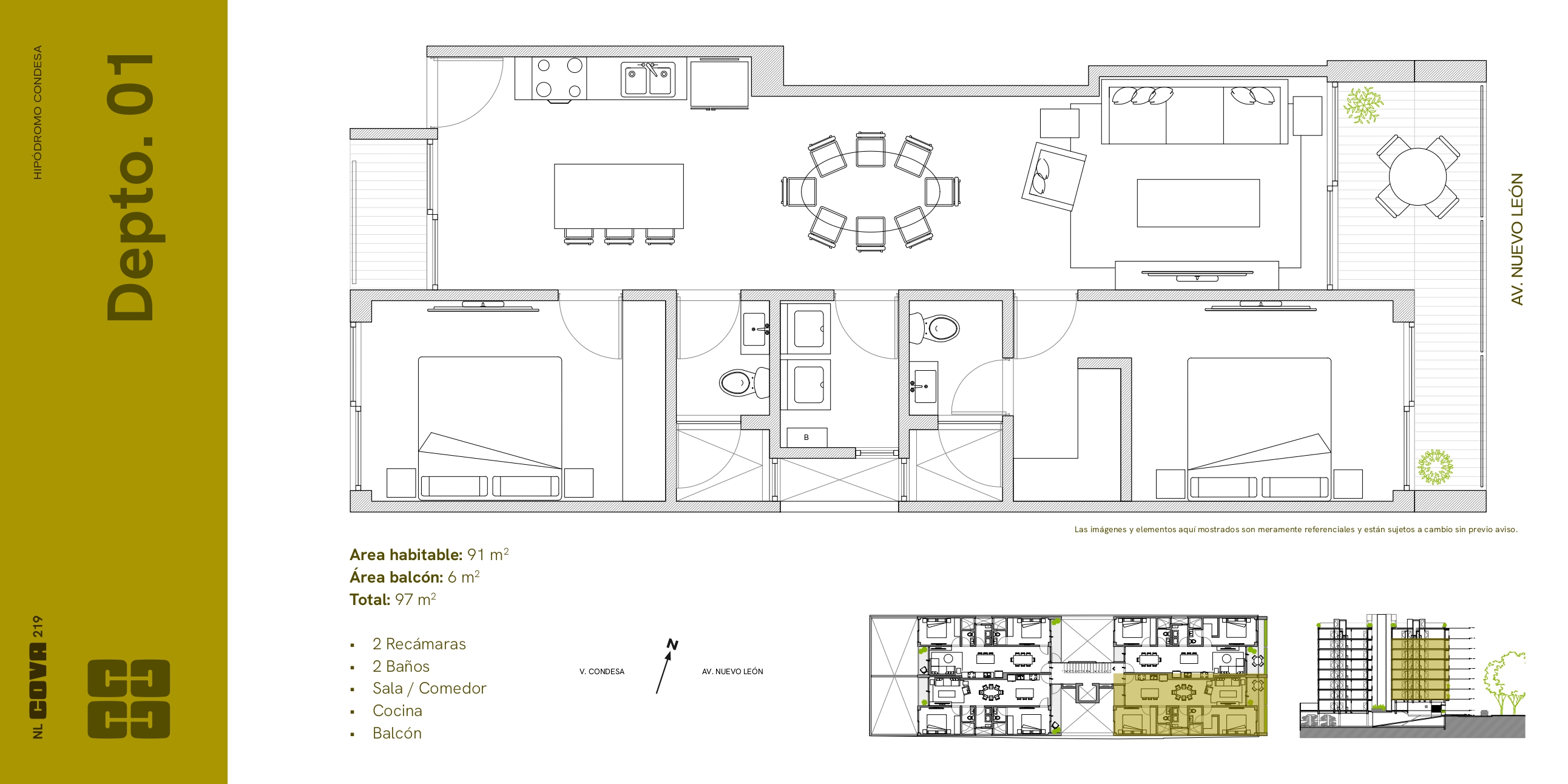 El proyecto de Nuevo León 219 consta de 30 unidades distribuidas en 8 niveles, además de un local comercial independiente. Todos son departamentos de 2 recámaras de 91 a 149 m2.