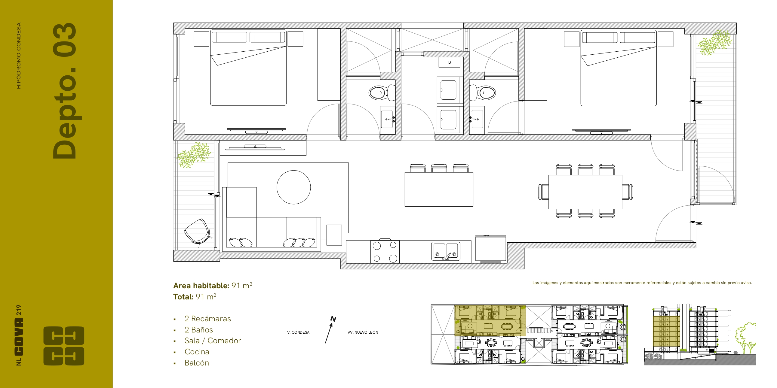 El proyecto de Nuevo León 219 consta de 30 unidades distribuidas en 8 niveles, además de un local comercial independiente. Todos son departamentos de 2 recámaras de 91 a 149 m².