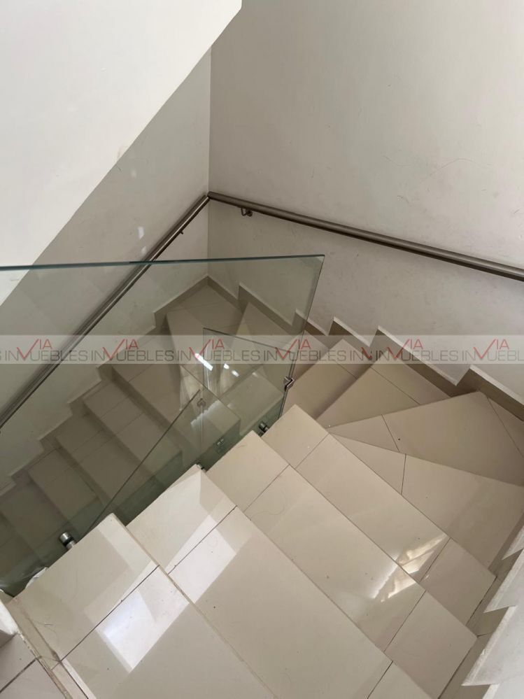 Hermosa casa en renta de 3 niveles, con cochera techada para 2 automóviles, la casa cuenta con cocina forrada de azulejo, espacio para sala comedor, medio baño de visitas y un cuarto abajo de las escaleras ideal para almacenar, en el segundo nivel están 2 recamaras secundarias con baño completo, estancia y el cuarto principal tiene baño completo y espacio amplio para vestidor, en la tercer planta está un baño completo, una 4ta recamara y dos terrazas, la más grande al frente y otra pequeña en la parte de atrás, la colonia cuenta con amenidades como alberca y casa club, vigilancia 24/7 y el mantenimiento es de $700.