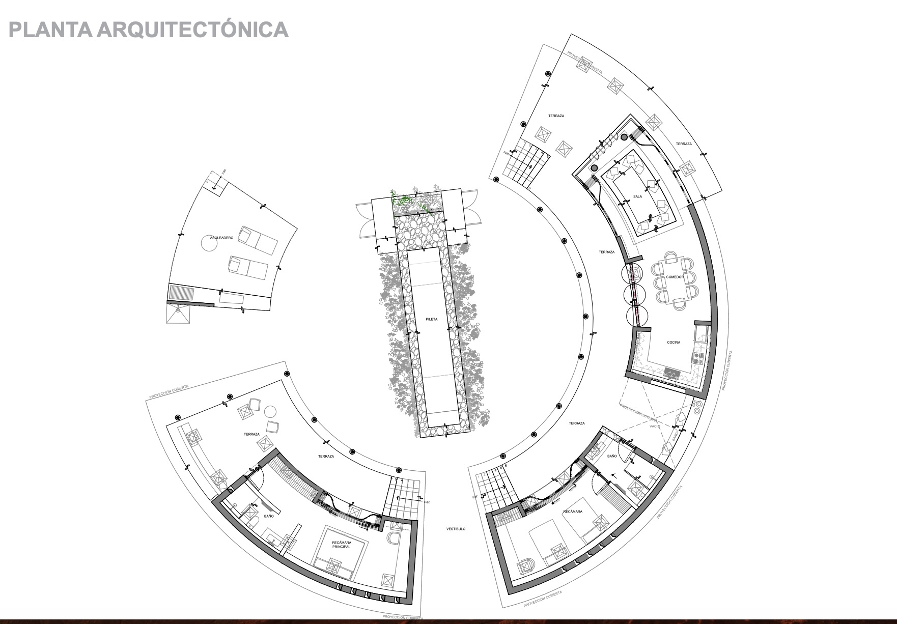 La propiedad cuenta con una residencia completamente terminada y en funcionamiento, diseñada bajo un concepto arquitectónico radial, organizado en torno a una distribución circular que favorece la ventilación, la privacidad y la experiencia espacial.