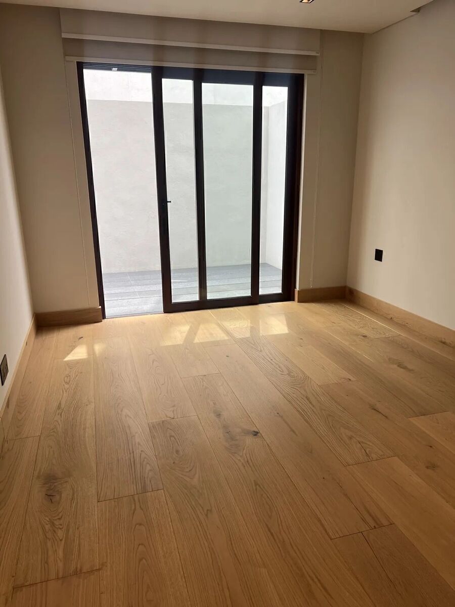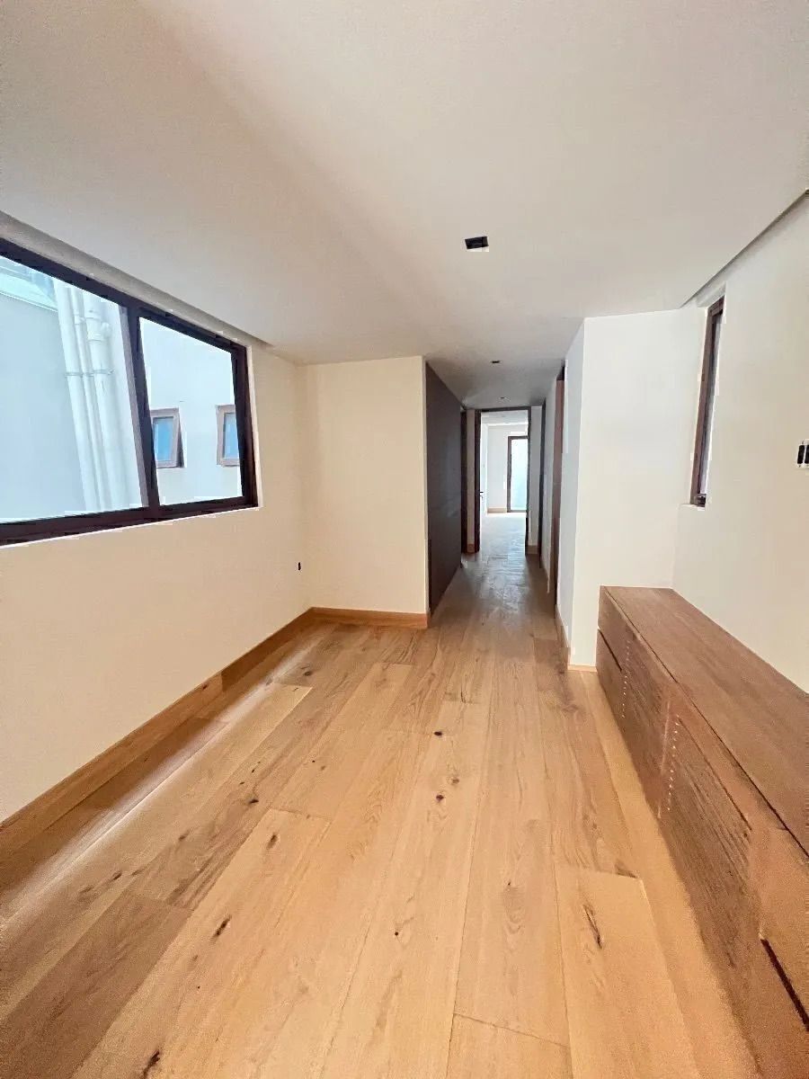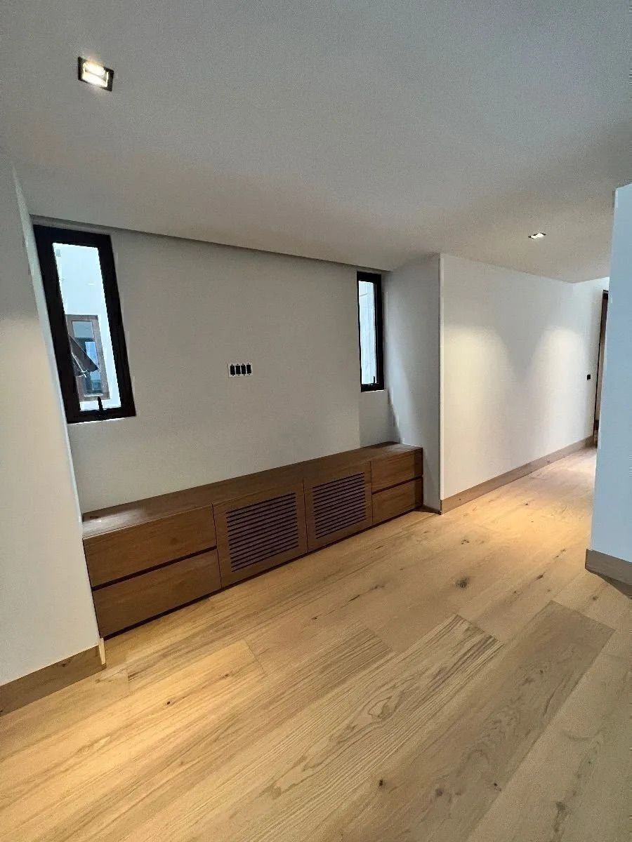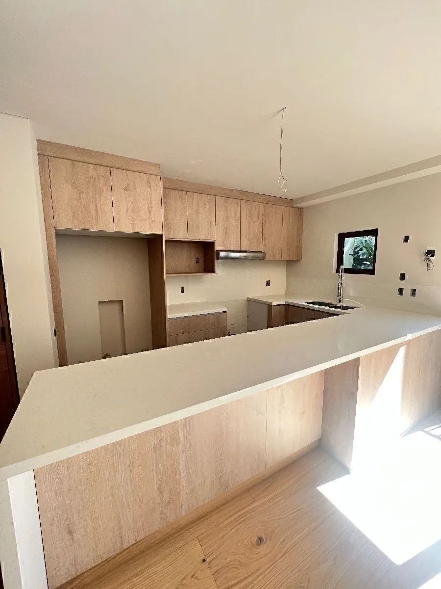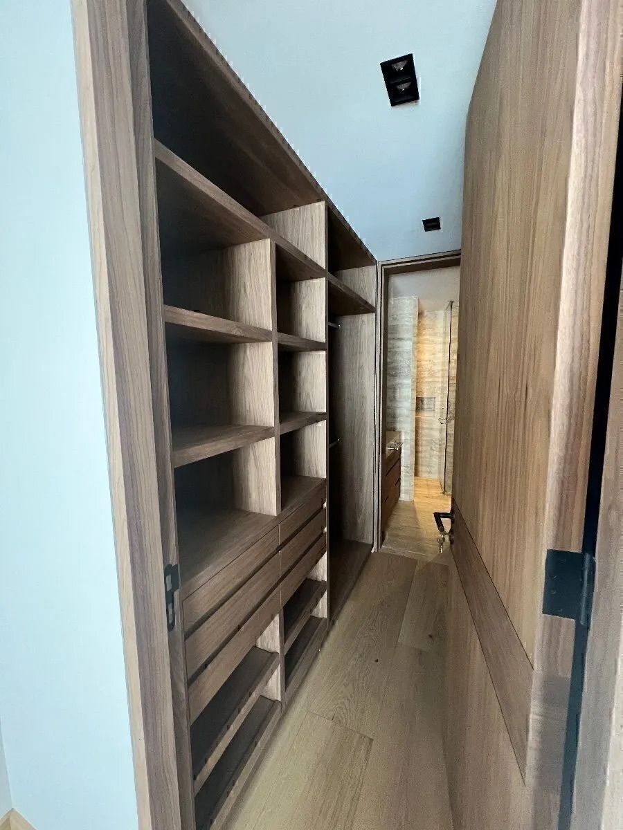 Acabados de lujo , closets y muebles empotrados de madera de nogal y mármol , pisos de madera . La cubierta de la cocina es de cuarzo blanco.