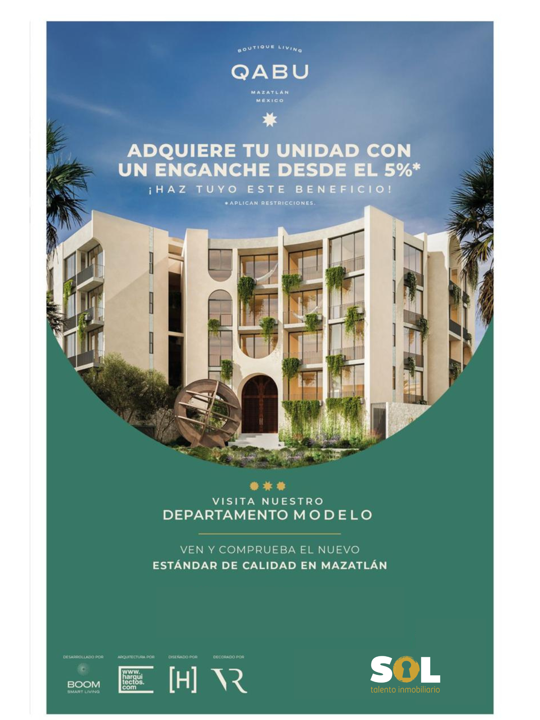 Ubicado muy cerca del corazón de La Zona Dorada, y de las playas más bonitas de la zona, QABU BOUTIQUE LIVING es un proyecto de 49 departamentos inspirado en el sur de España. Su esencia se refleja en sus colores, texturas, enjarres pigmentados, acabados, formas y curvas suaves. Sus plantas cítricas y olivas le darán el toque de paz y tranquilidad. Qabu cuenta con áreas al aire libre llenas de armonía y una vegetación ambiente por el Jardín Botánico de Culiacán, donde podrás disfrutar momentos familiares y recreativos.