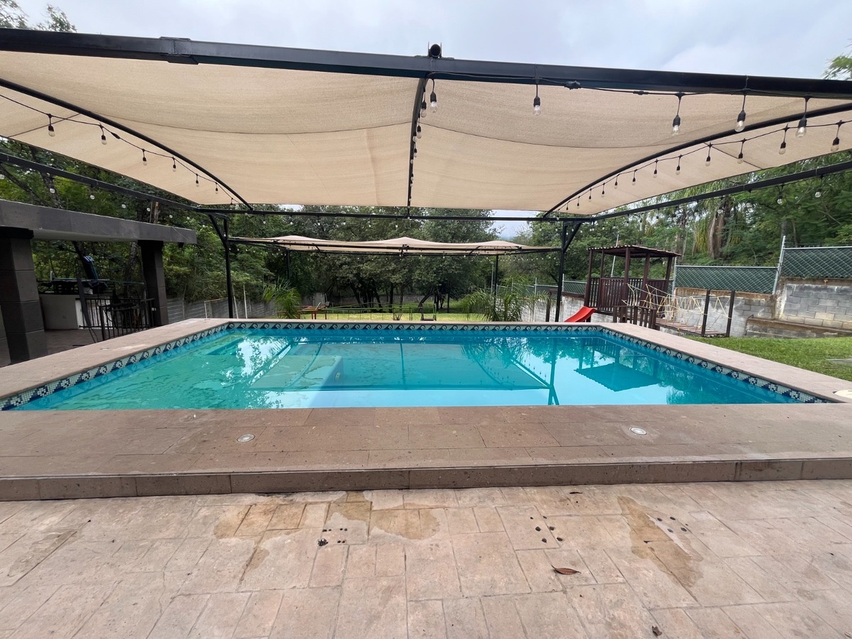 Barda perimetral con iluminación en toda la propiedad, acceso con portón eléctrico. Amplio estacionamiento que puede albergar en su interior hasta 8 autos. Amplios jardines, alberca techada con malla sombra , 2 baños completos para área de la alberca . Amplia Bodega, cuarto de máquinas y equipos de filtración de alberca. Terraza techada con área de asador y comedor exterior , Palapa aun lado de la alberca .