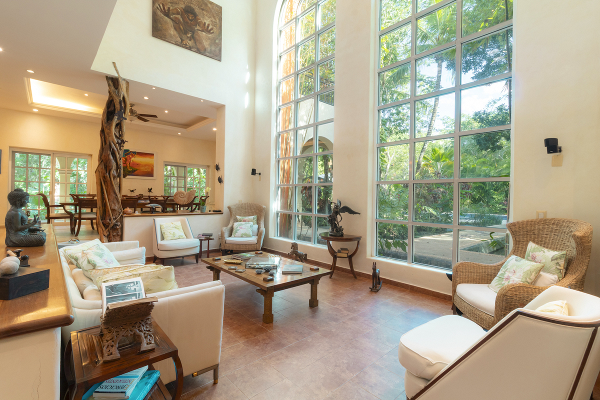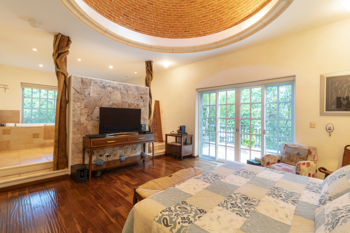 La propiedad ofrece cinco recámaras, cada una con baño completo y vestidor, una sala de doble altura con ventanales que enmarcan la naturaleza, cocina equipada, comedor para diez personas, terrazas abiertas y techadas, así como un área de TV familiar.