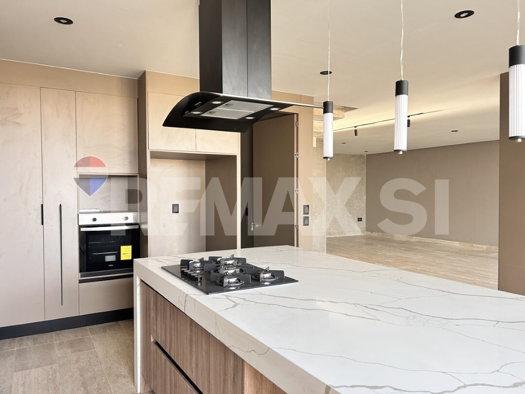 Cocina equipada con barra desayunador con cubierta de cuarzo, lavavajillas, horno de convección y amplios espacios para almacenar.