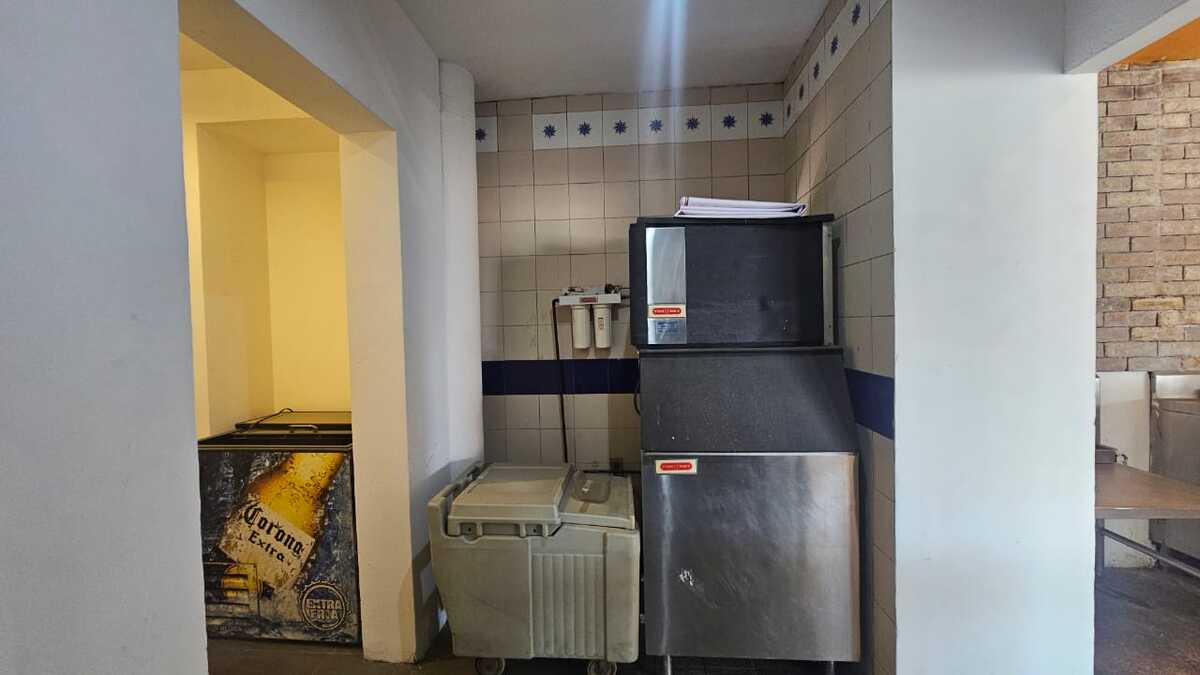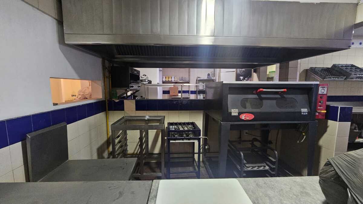 Cocina equipada: mesas de trabajo, horno para pizzas, hielera y barra de servicio