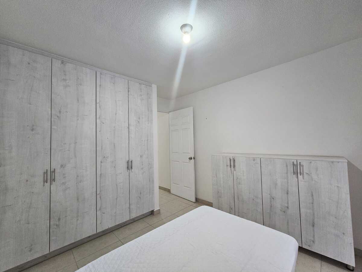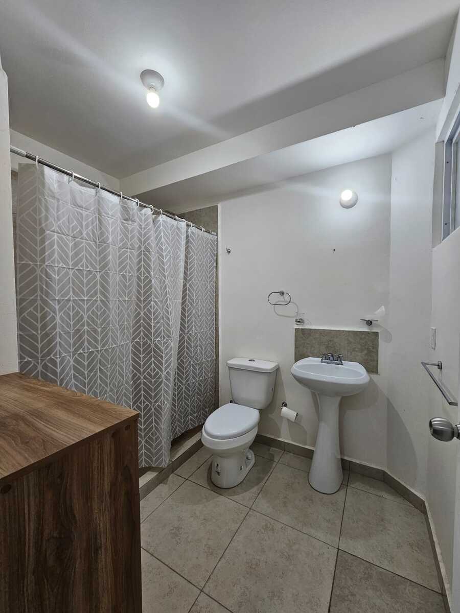 Planta baja en esquina, cuneta con dos habitaciones, un baño grande, sala comedor, cocina equipada, cuarto de lavado techado, patio trasero, completamente amueblado.