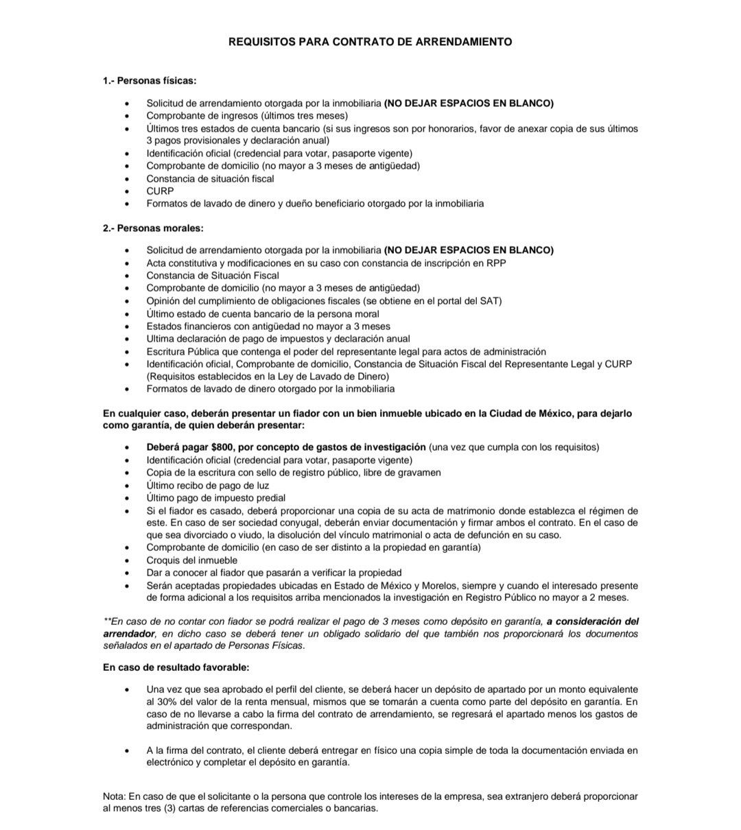 Ingresos 3 a 1, Obligado solidario + 3 meses de Garantia en caso de no contar con aval, así como el pago de la investigación de la propiedad $950