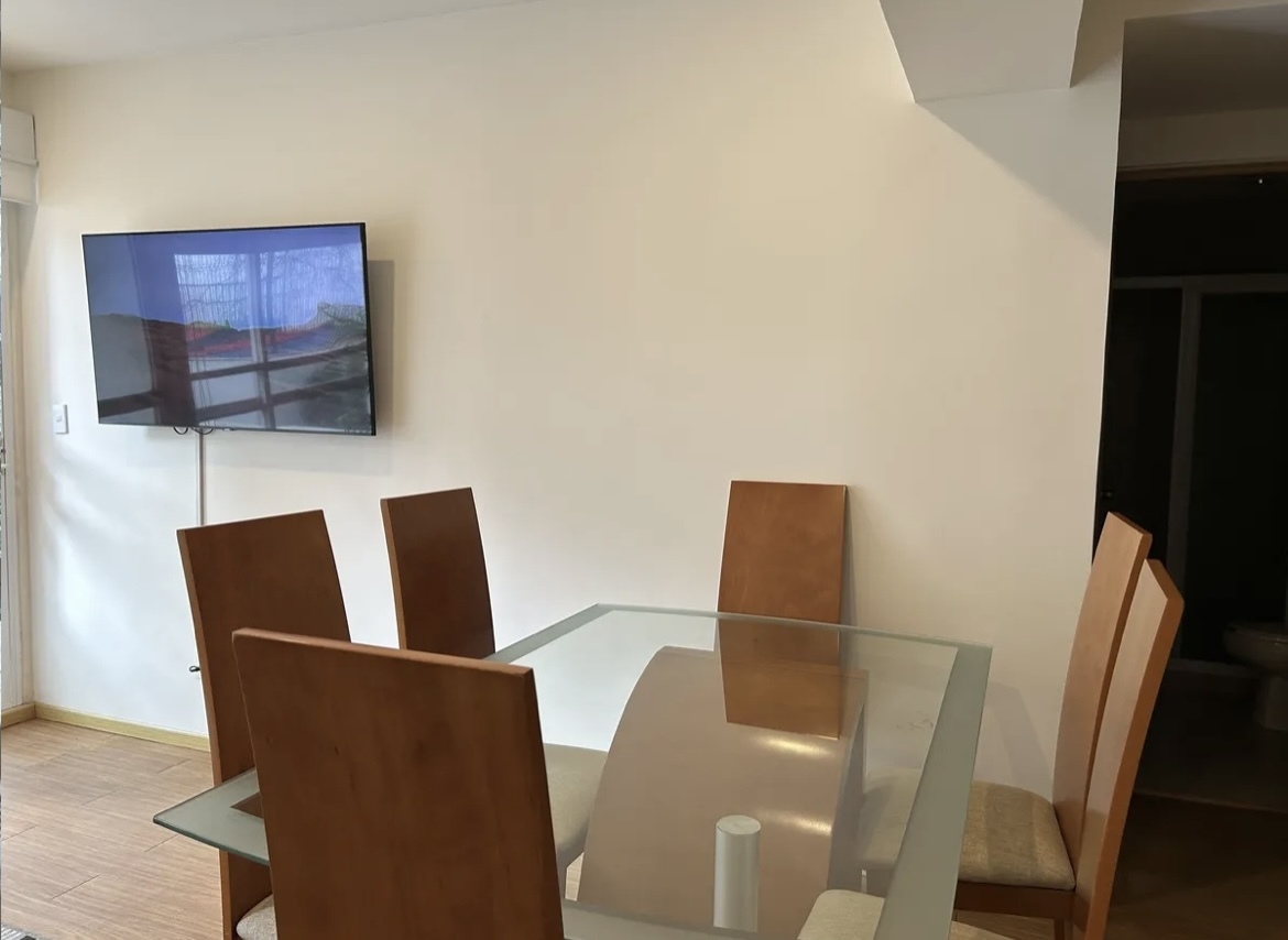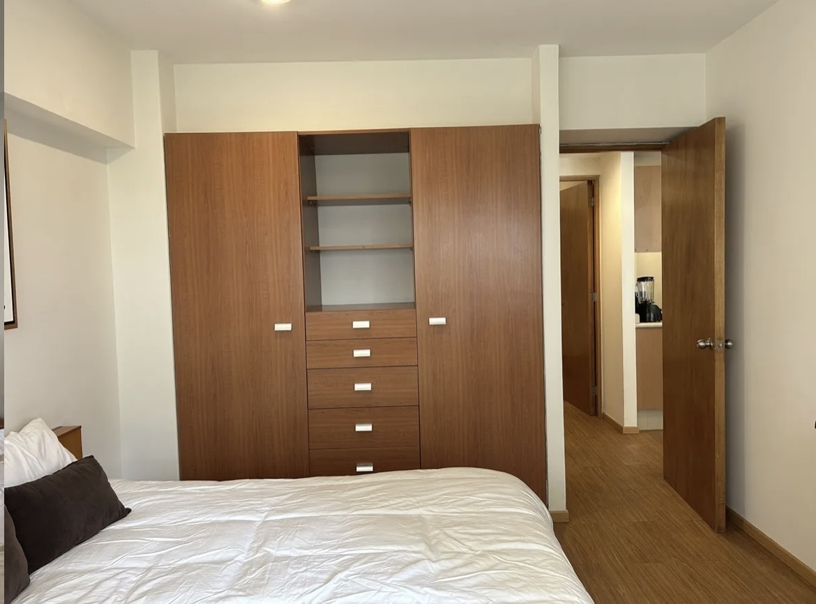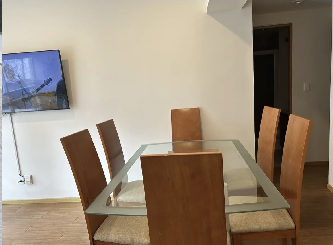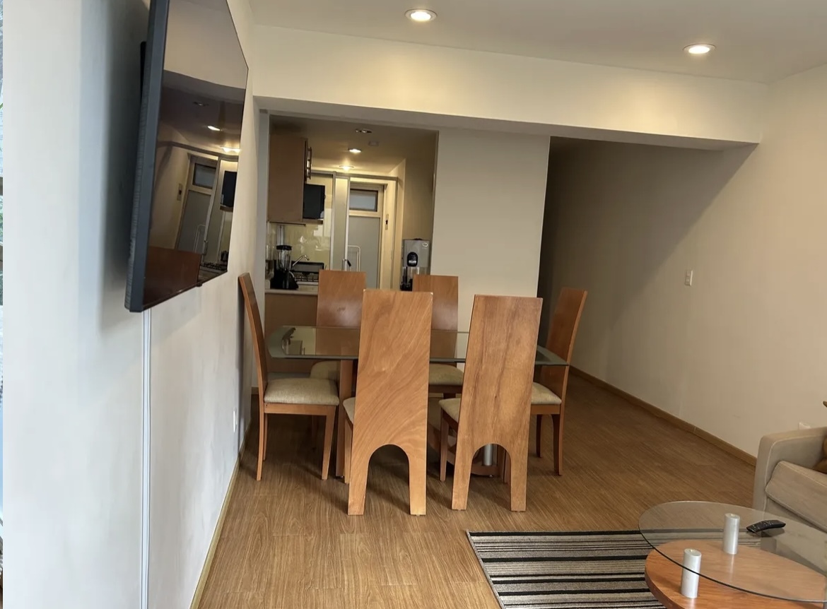 Departamento amueblado, primer piso, 77 m2 sup, 2 recámaras, 1 baño, sala y comedor, cocina integral abierta con barra, área de lavado, baño de visitas y balcón.