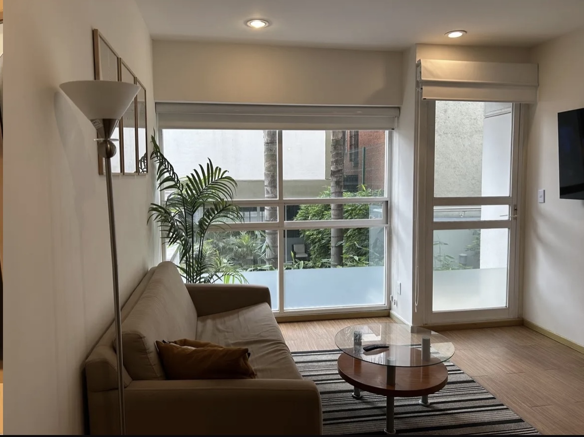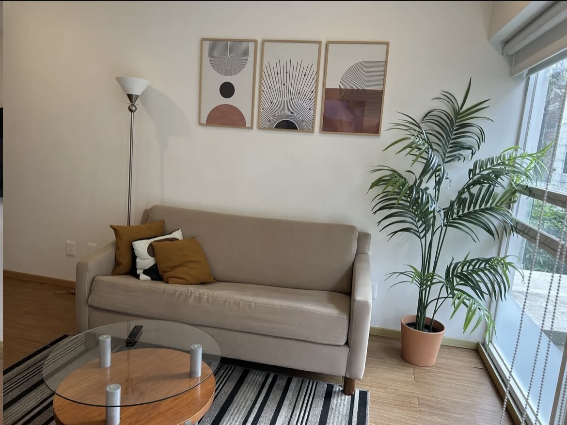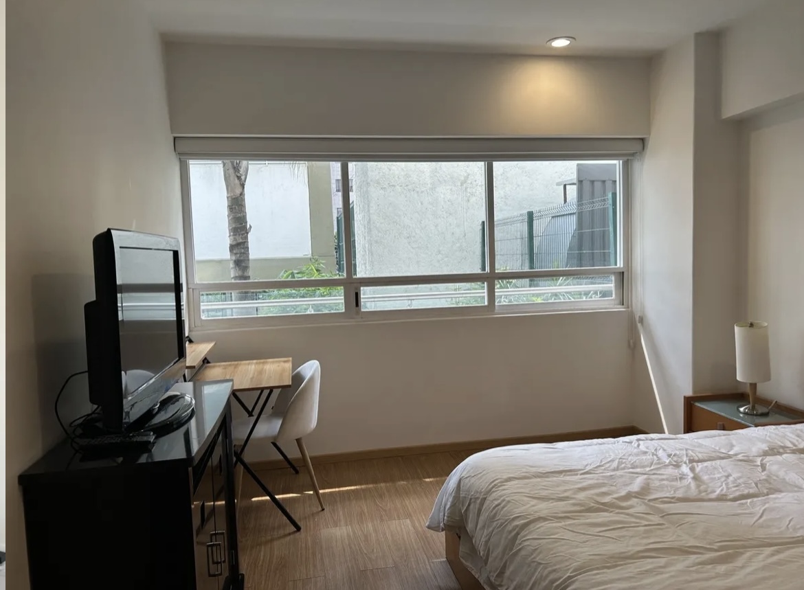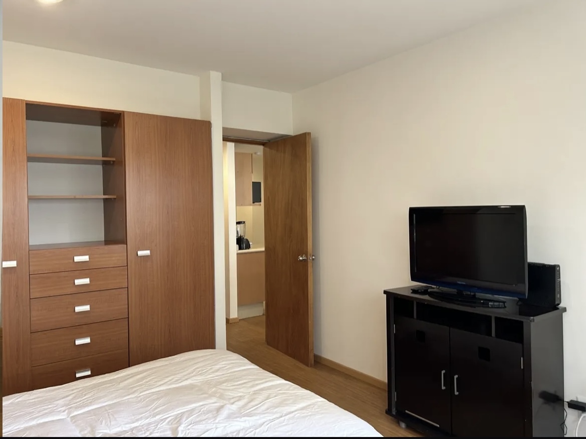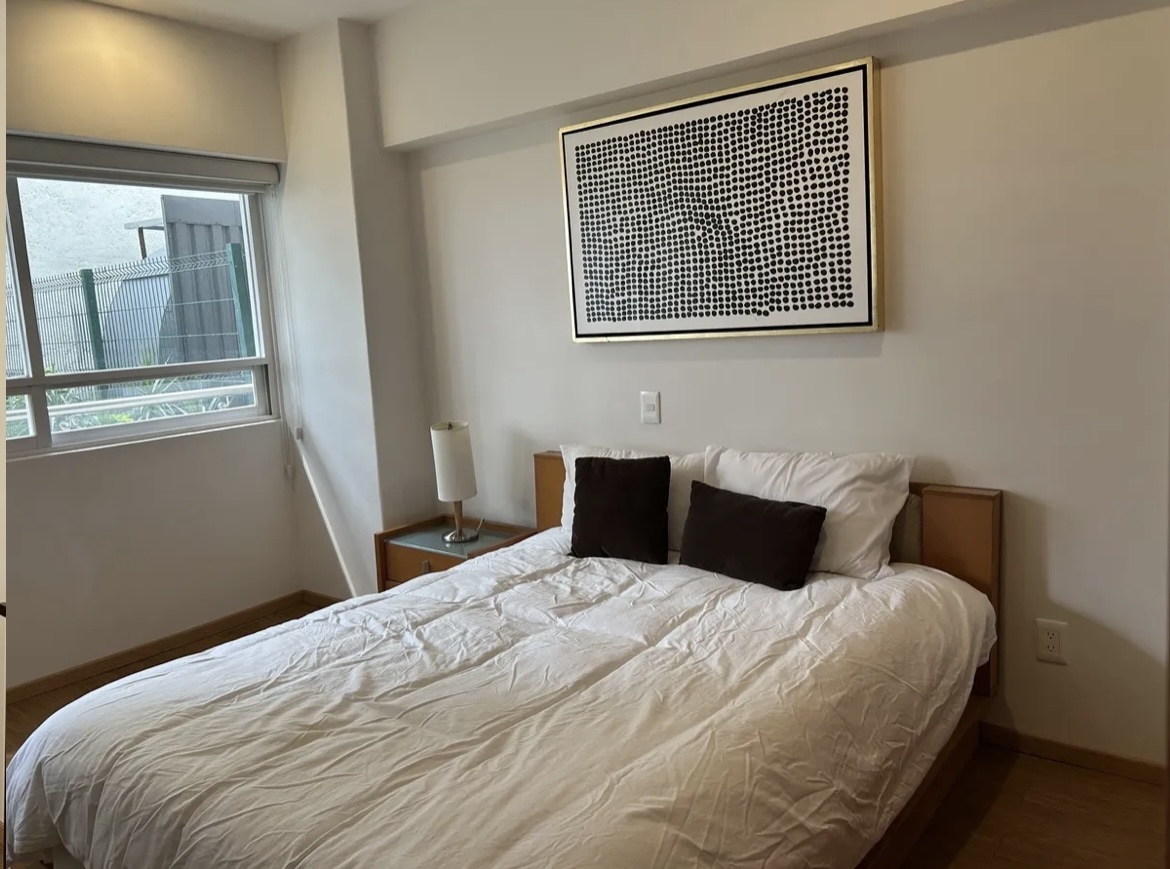 Departamento amueblado, primer piso, 77 m2 sup, 2 recámaras, 1 baño, sala y comedor, cocina integral abierta con barra, área de lavado, baño de visitas y balcón.