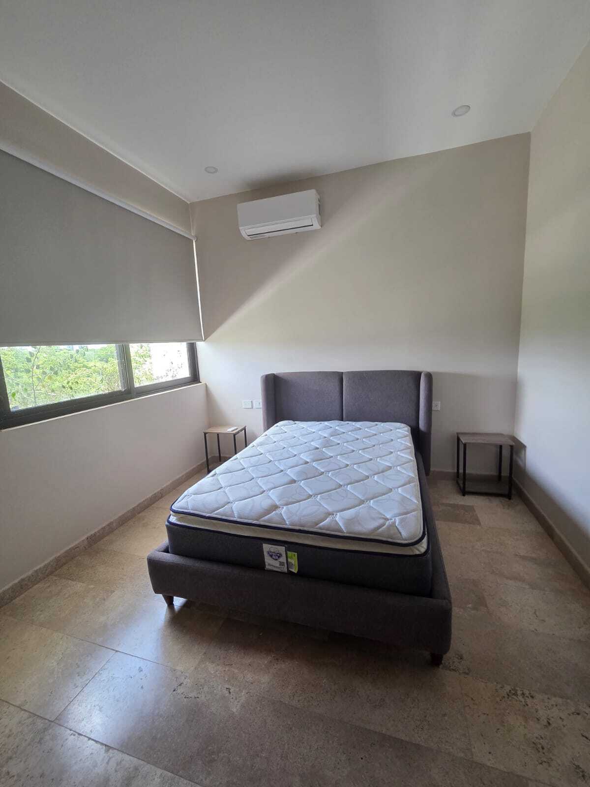 Recámara secundaria con cama matrimonial, cabecera y buros, aire acondicionado, closet vestido, baño completo, persianas y mosquiteros.