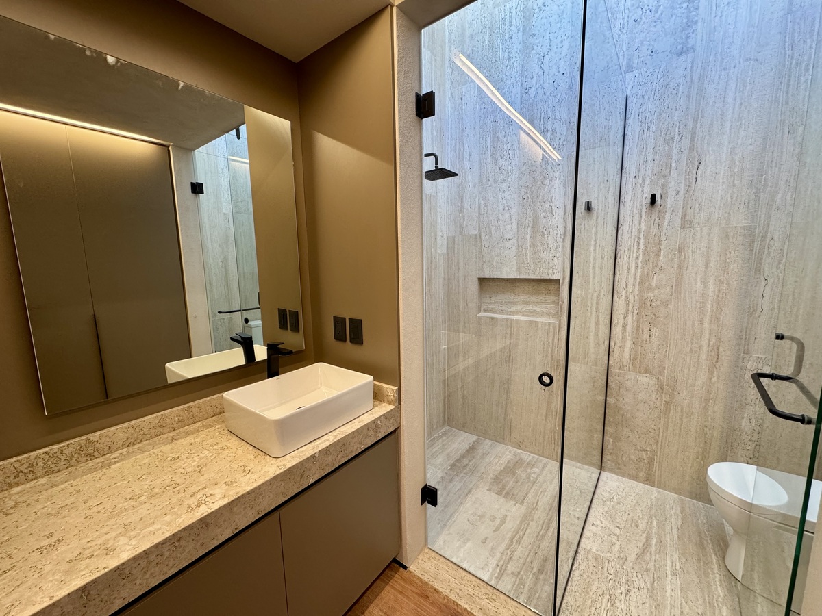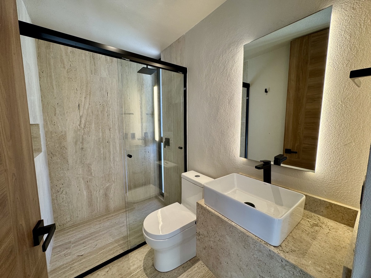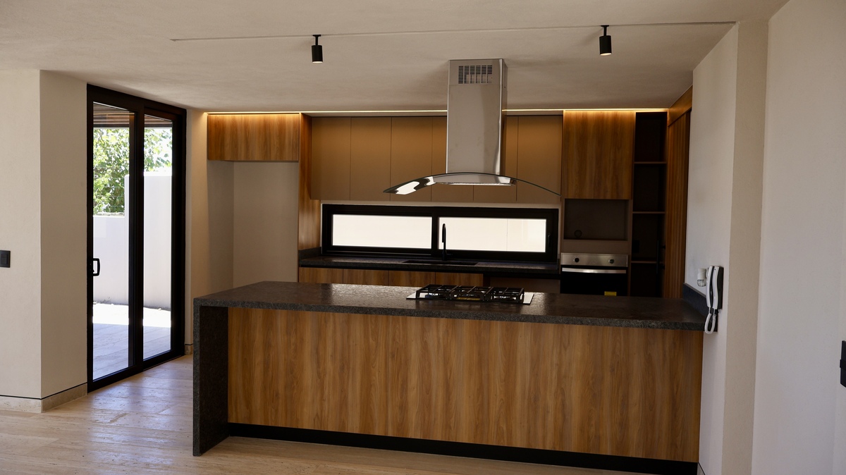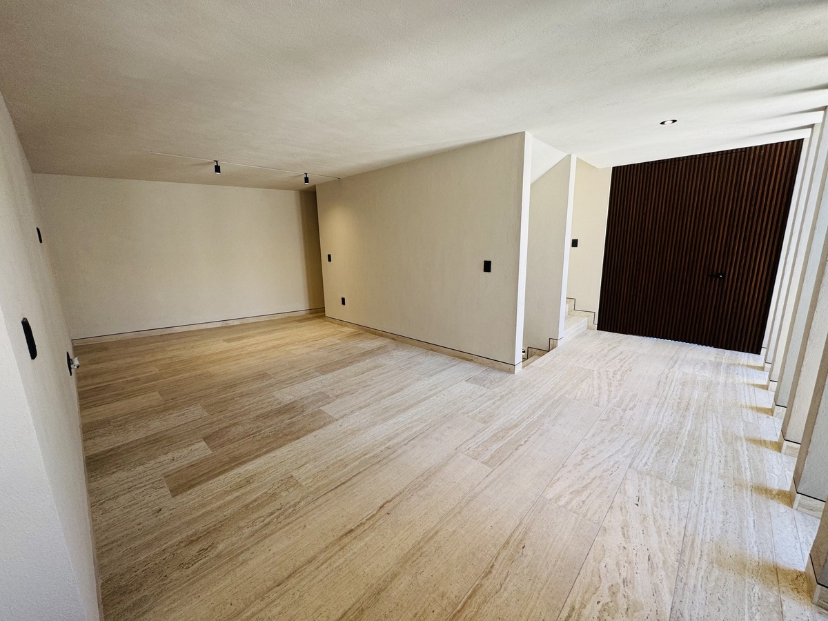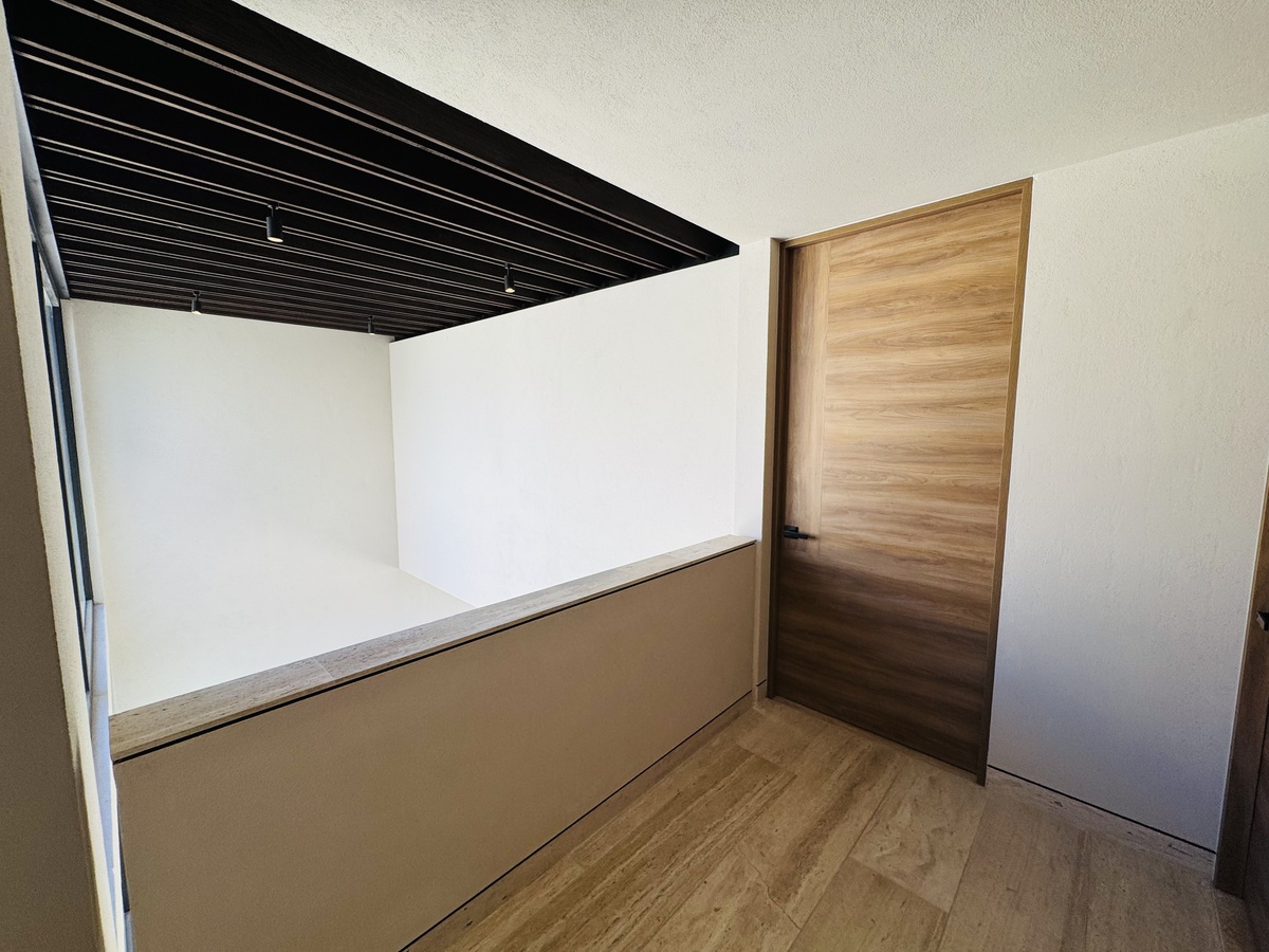 PB: Estacionamiento para 3 autos, estudio (o 4ta recámara), baño completo, sala a doble altura, bar, comedor, cocina equipada con alacena, terraza techada, patio interior, bodega y jardín.