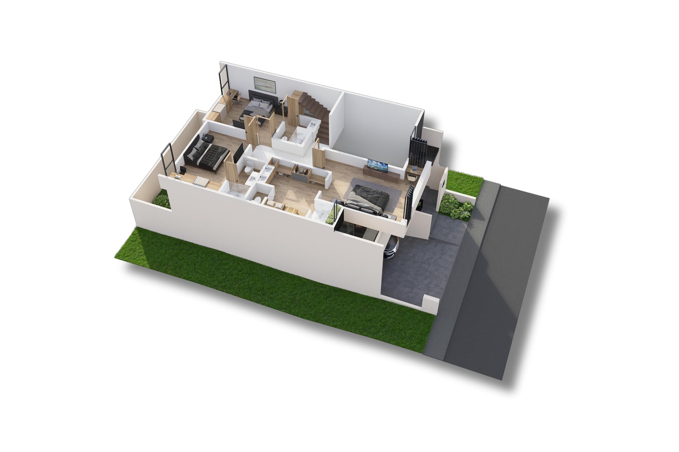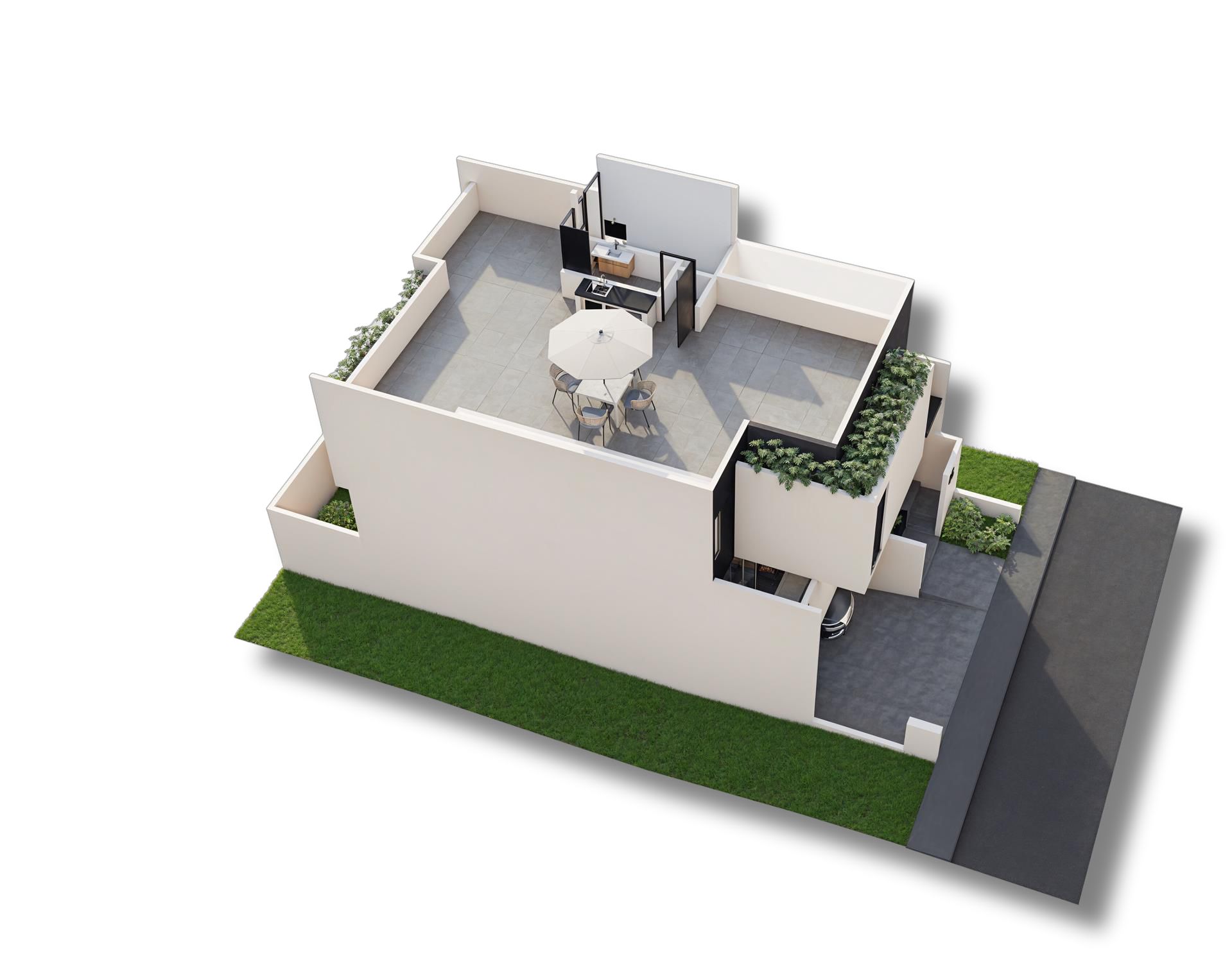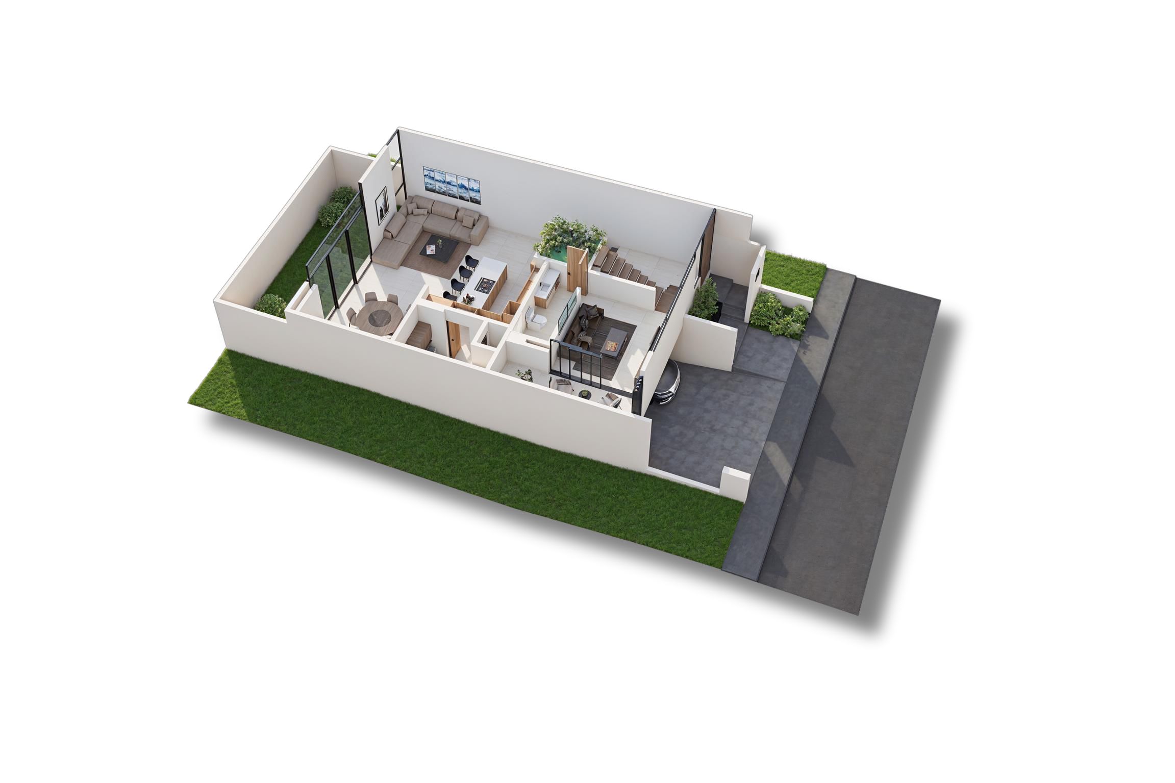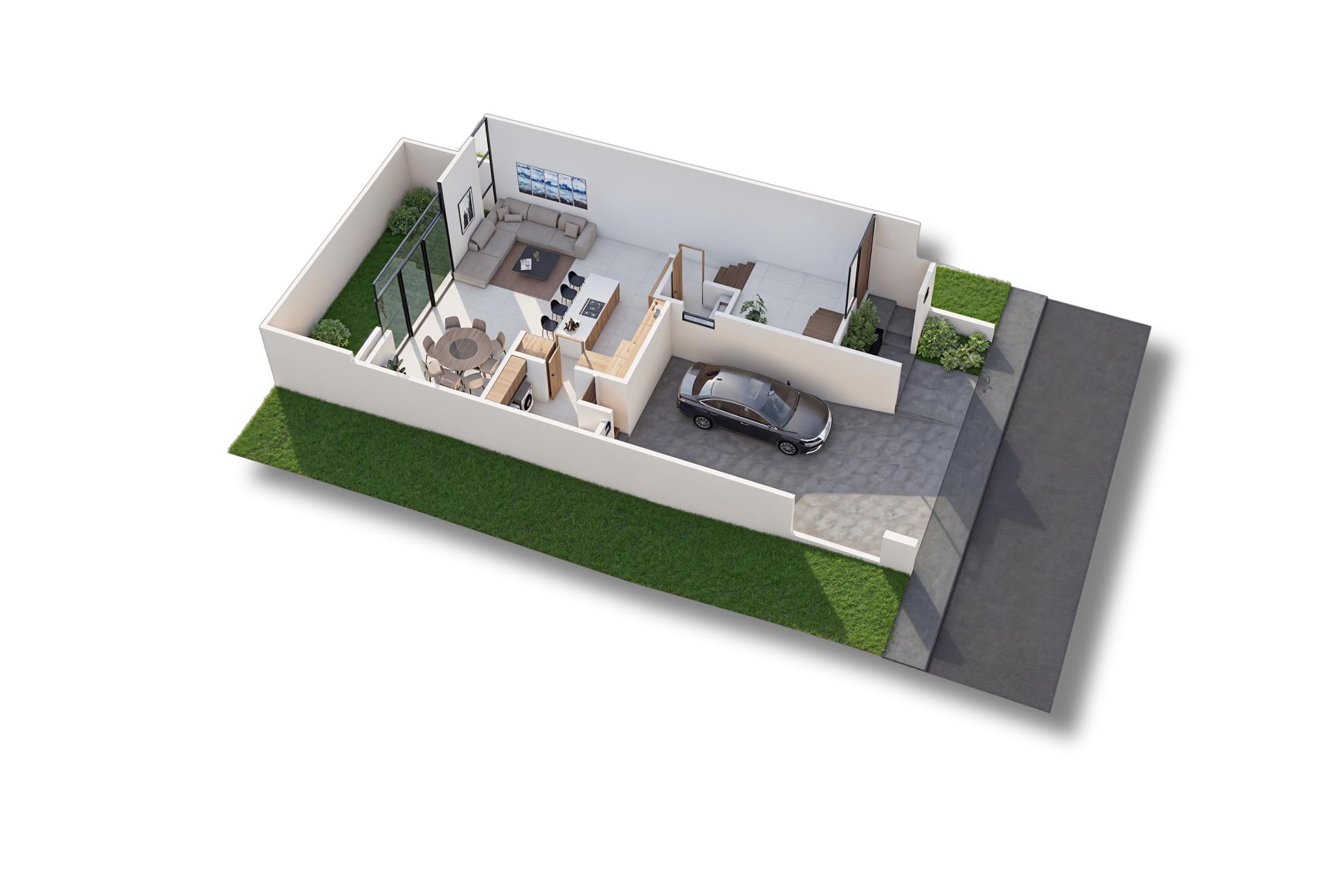 Planta baja: 1/2 baño, Cochera techada para 2 autos, Acceso de servicio, Cuarto de lavado, Cocina integral con cubierta de cuarzo, Sala- comedor con altura y media, jardín de 25 m2