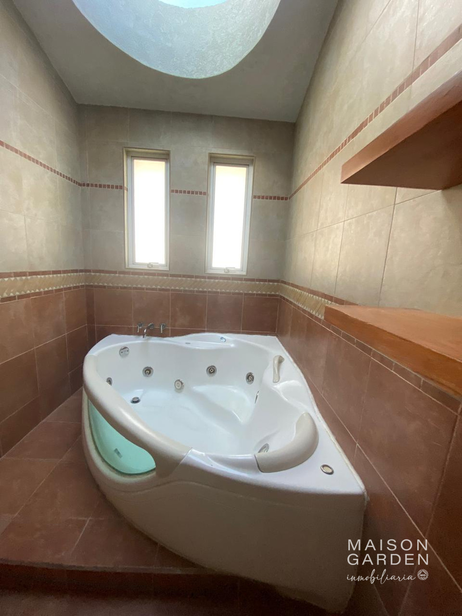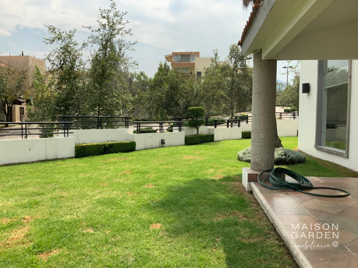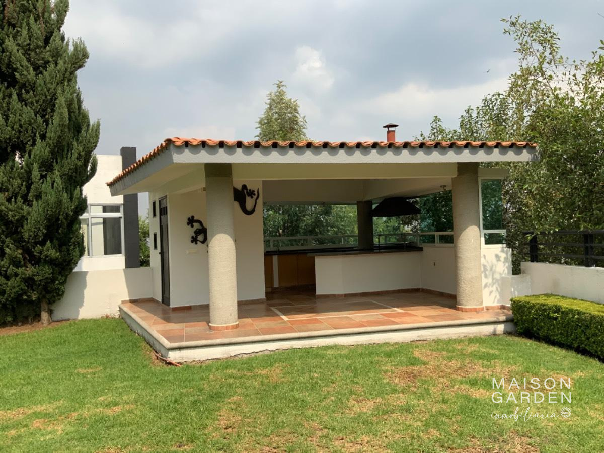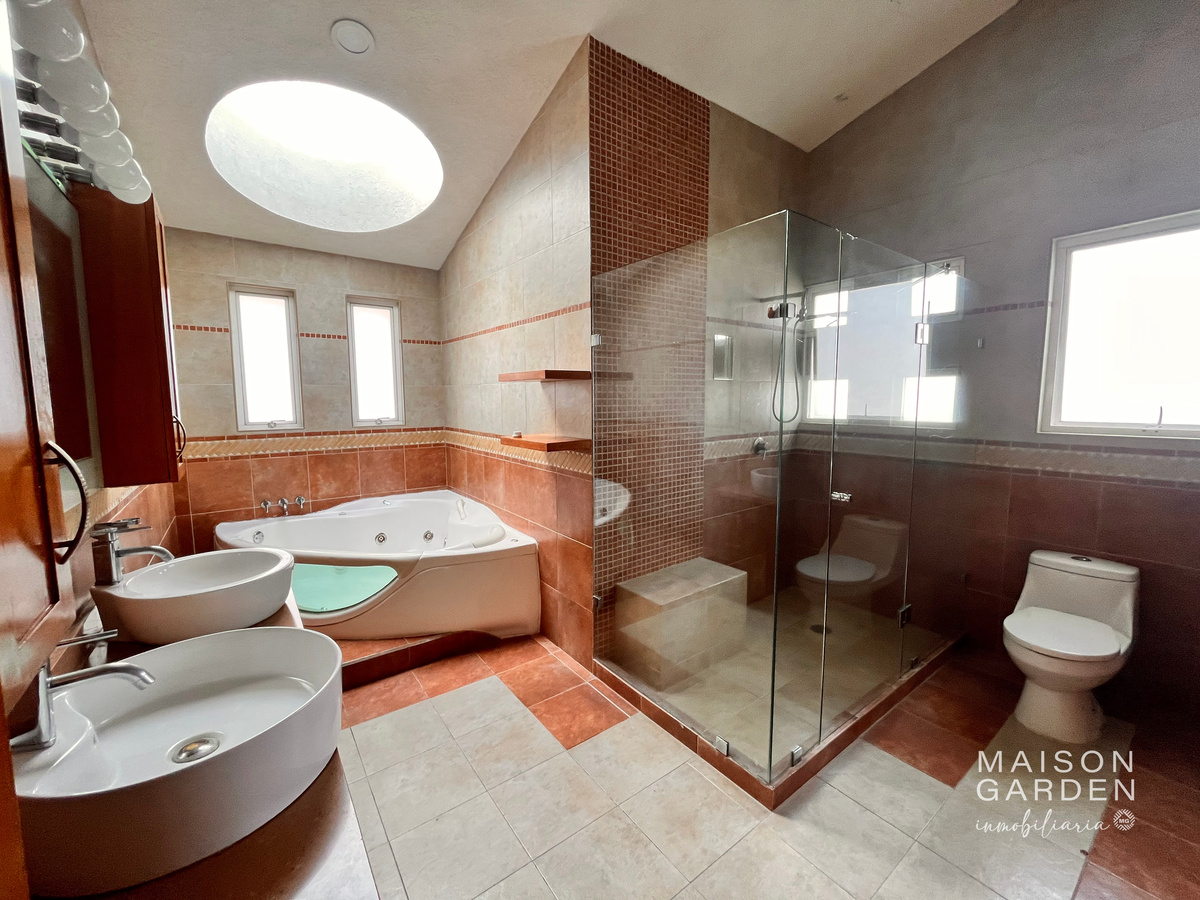 En el exterior, un espacioso jardín con palapa, asador y medio baño complementan el área social. La cochera techada tiene capacidad para cuatro autos.