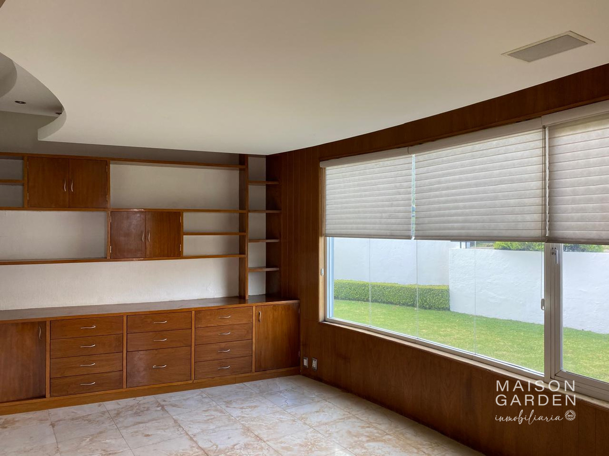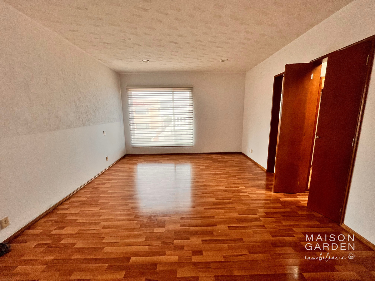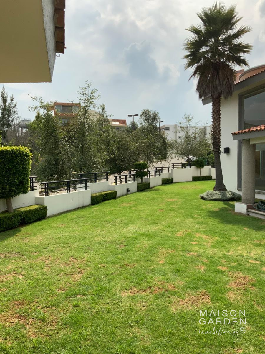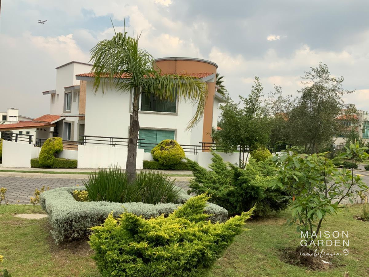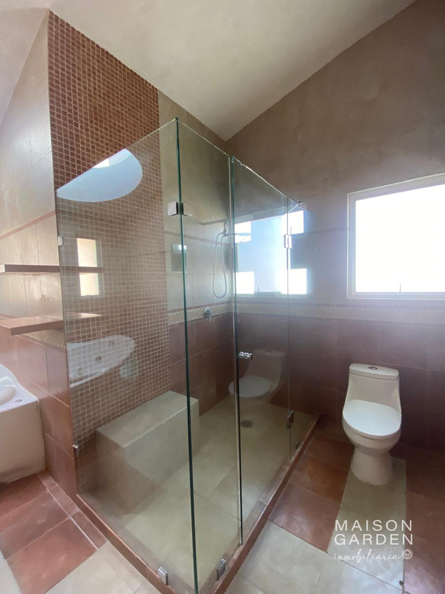 En el exterior, un espacioso jardín con palapa, asador y medio baño complementan el área social. La cochera techada tiene capacidad para cuatro autos.