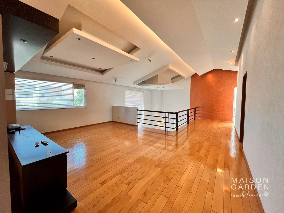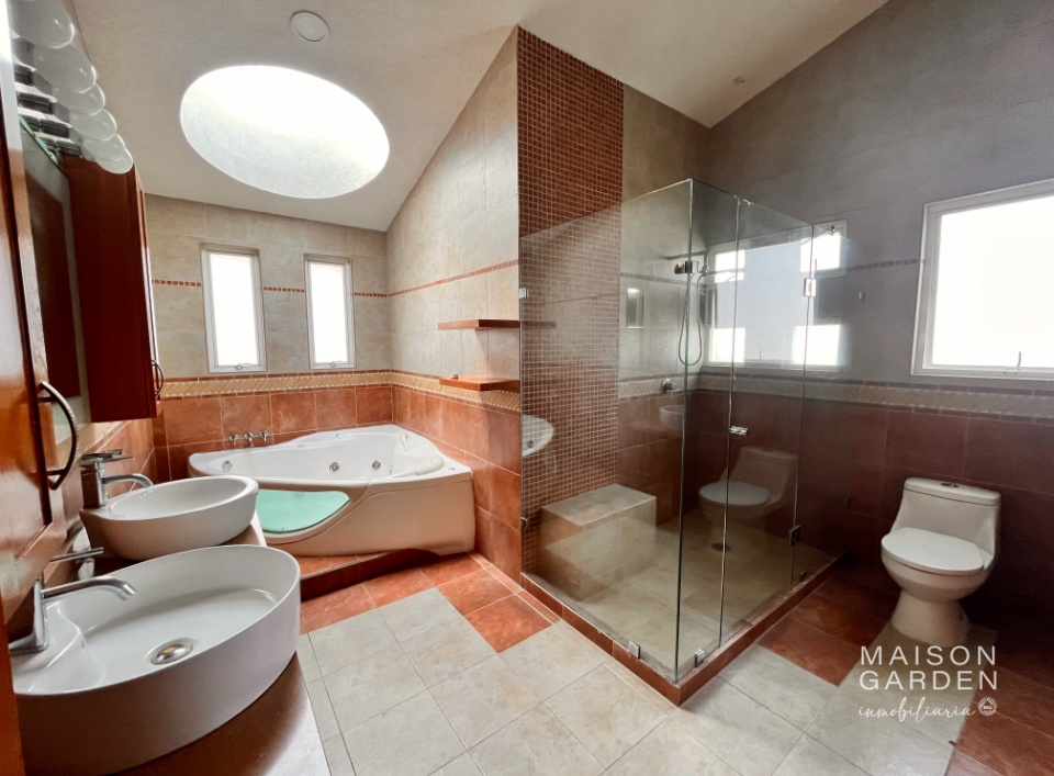 En la zona privada, se encuentran cuatro recámaras, todas con baño y vestidor; la principal incluye una tina de hidromasaje; sala de TV que brinda confort