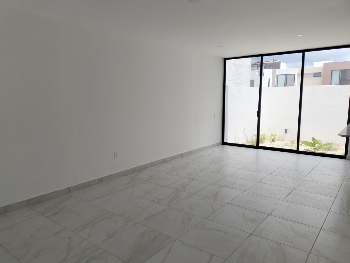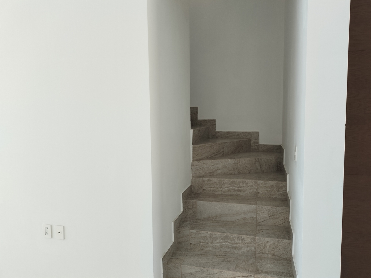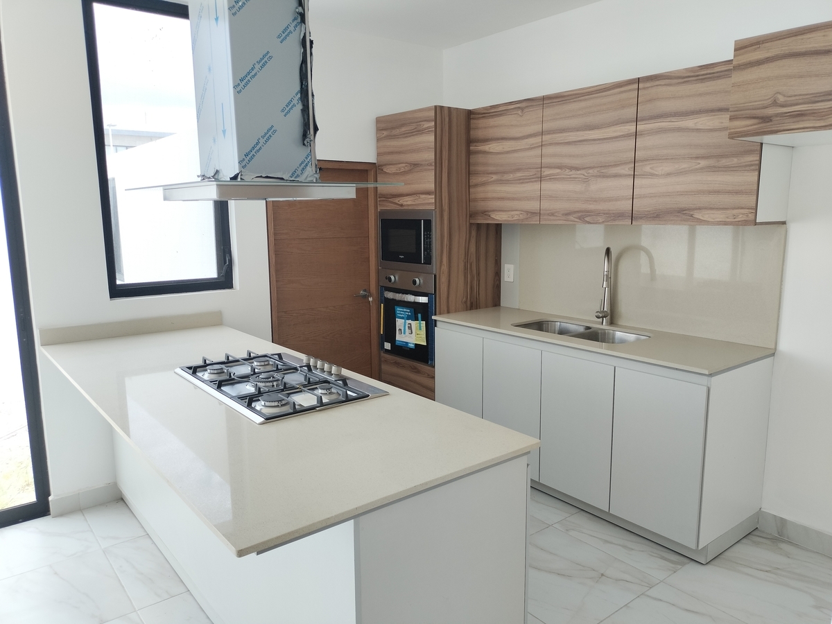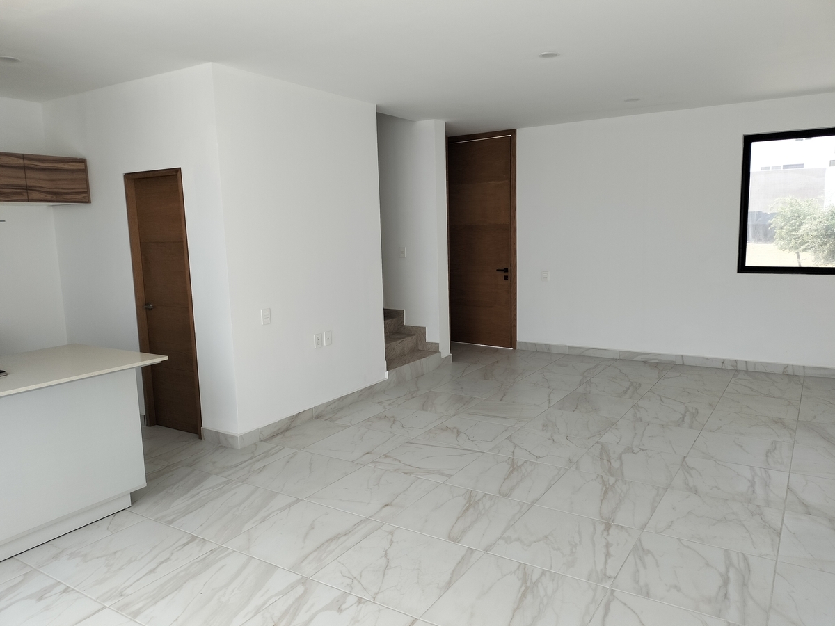 Sala, comedor, cocina, barra con cubierta de cuarzo, patio de servicio, cochera para 2 autos, 1/2 baño, cuarto de servicio y alacena amplia.