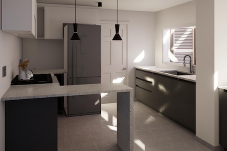 Comedor junto a cocina cerrada con alacena y area para lavandería.