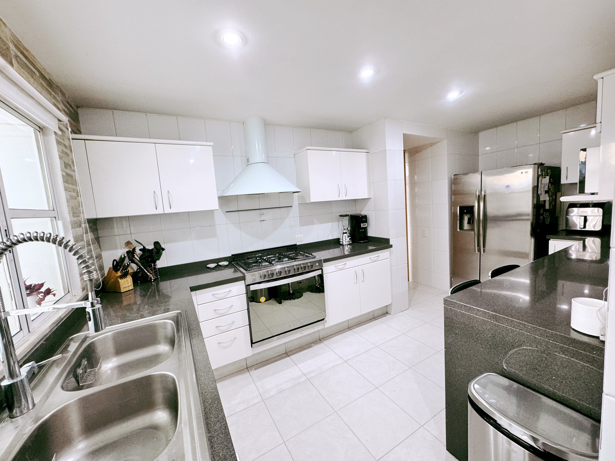 Cocina cerrada totalmente remodelada con cubierta de granito, amplia despensa y abundante almacenamiento.