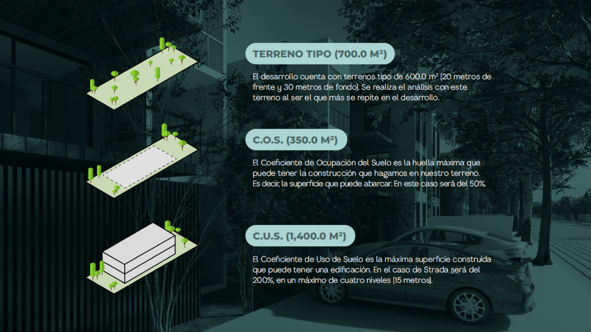 Terrenos destinados para viviendas multifamiliares, de alta densidad y de usos mixtos. La primera etapa contempla 38 terrenos con una ubicación privilegiada, distribuyéndose desde el acceso del desarrollo, a lo largo de la avenida principal, hasta el primer módulo del parque central (Metrópoli) donde se encuentran la casa club como el complejo deportivo.