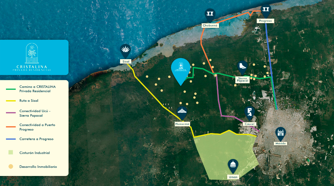 • Ubicación: Cerca del mar (a solo 24 km de la playa), y conectado al cinturón industrial, Puerto Progreso y Sierra Papacal.