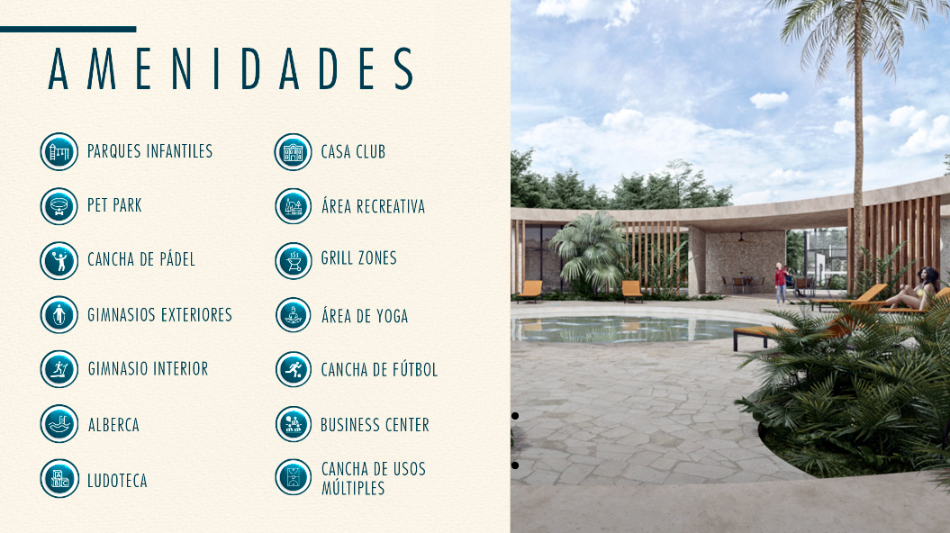 • Deportes de Lujo: Más de 17 amenidades para todos los gustos: Cancha de Padel, Gimnasio Interior y Exterior, Cancha de Fútbol y Cancha de Usos Múltiples.