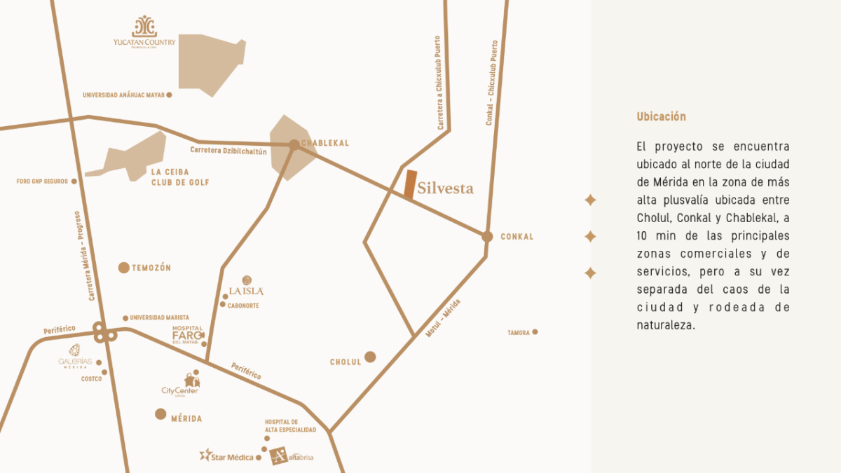 SILVESTA Privada Residencial, es un conjunto de 196 lotes residenciales con amenidades situado a 10 minutos del periférico de Mérida y a menos de 20 minutos de la playa de Chicxulub Puerto, en la costa Esmeralda de Yucatán.