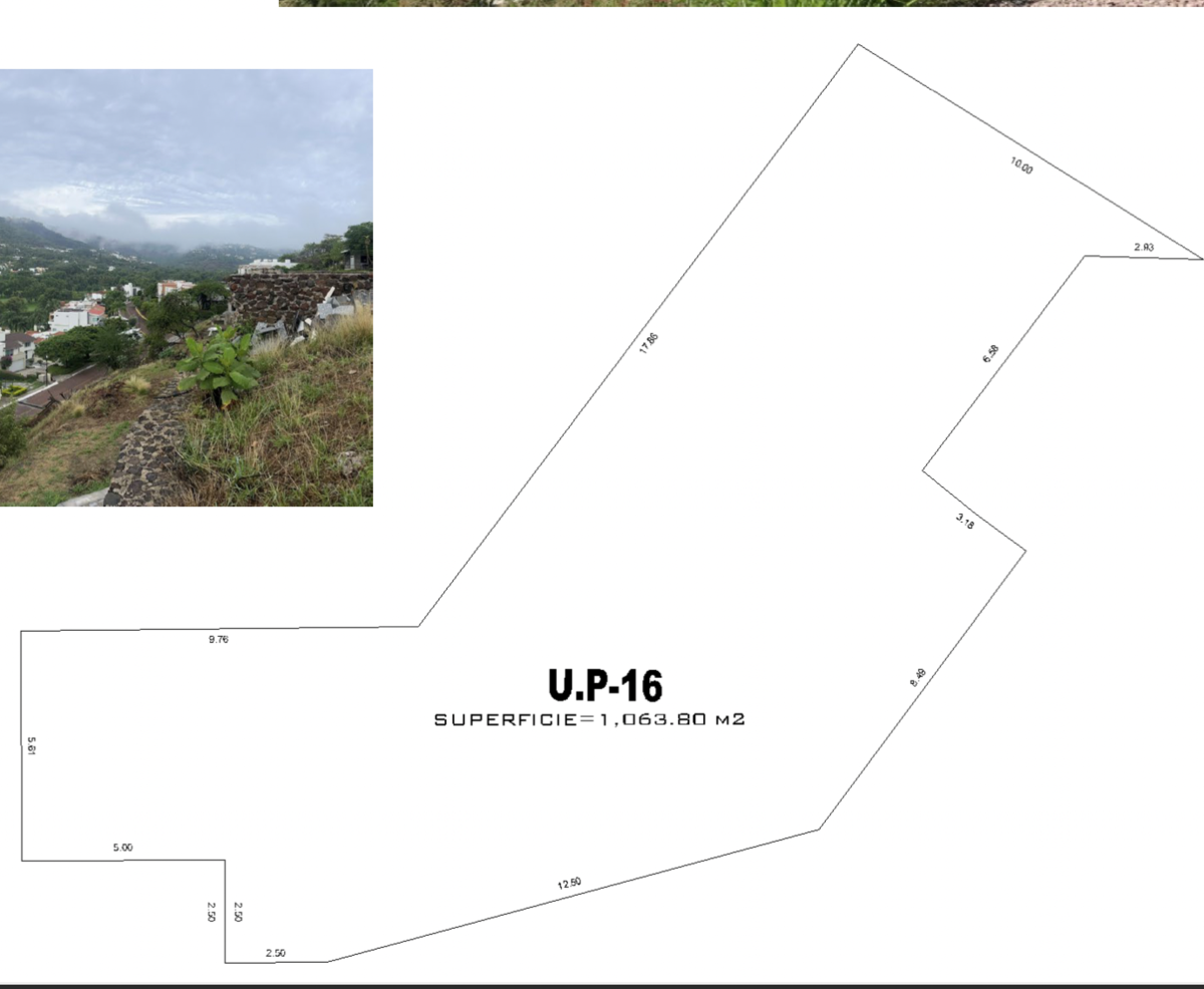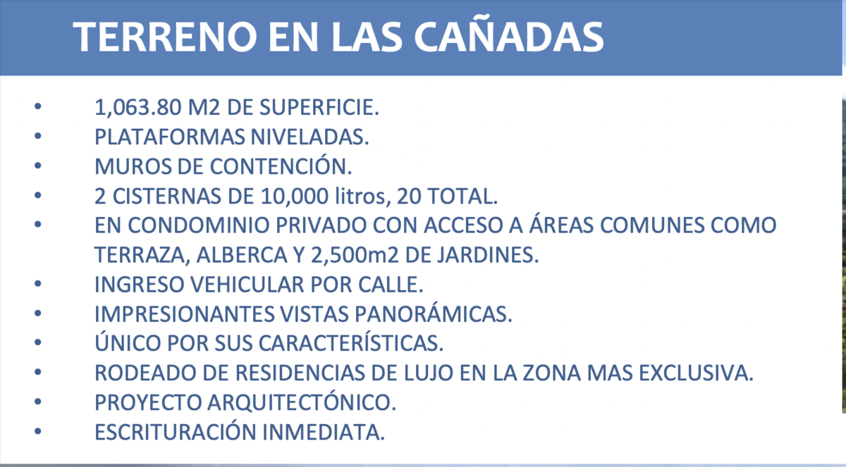 El terreno cuenta con1,063.80m2, plataformas niveladas, muros de contención, 2 cisternas de 10,000 litros. Único por sus características, rodeado de residencias de lujo, en la zona más exclusiva de Las Cañadas. Cuenta con proyecto arquitectónico.