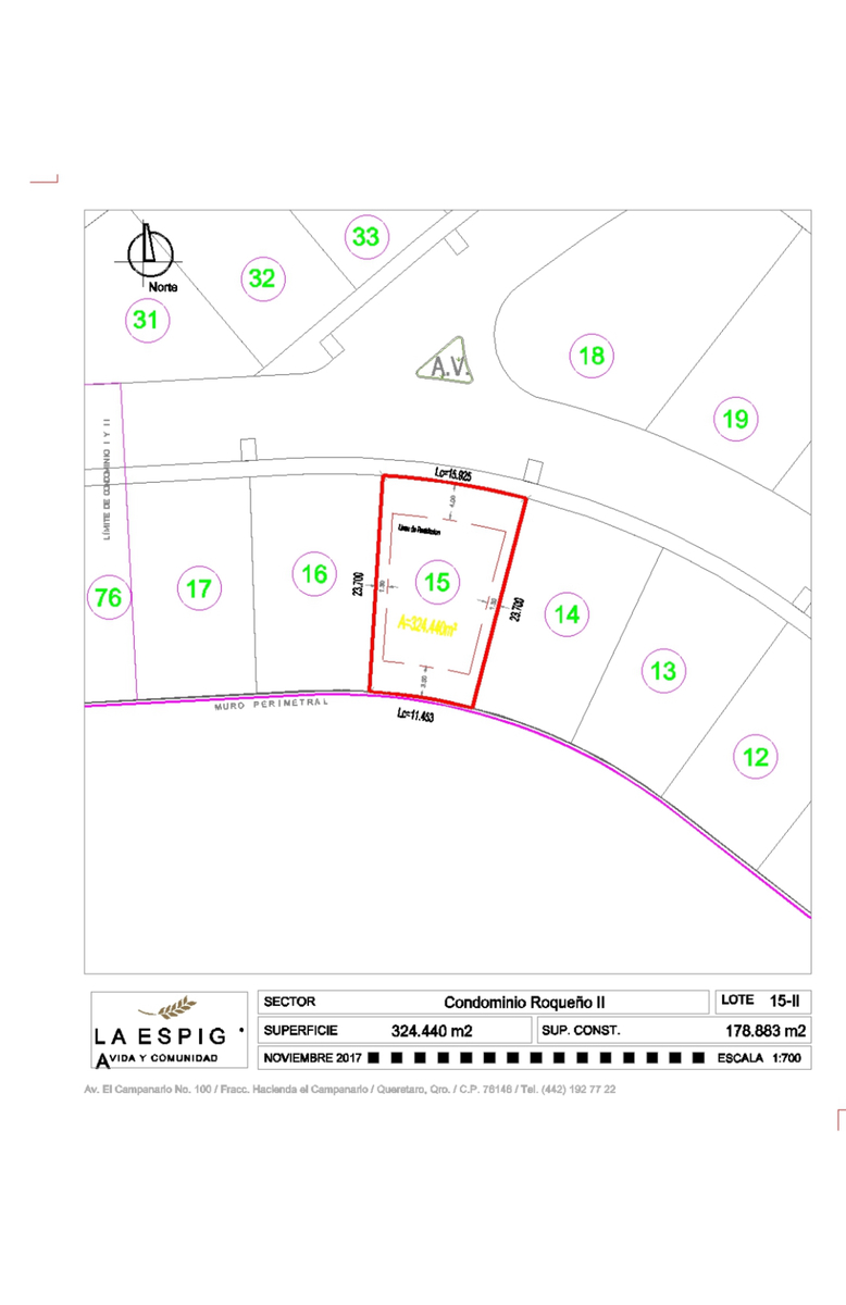 Tiene un frente de 11.45 metros, un largo de 23.70 metros y un fondo de 15.82 metros.