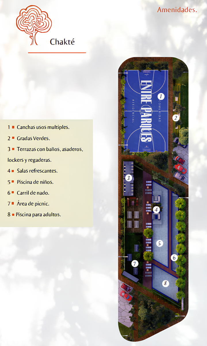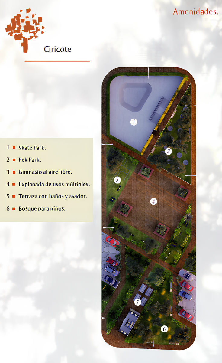 El proyecto está conformado por una avenida principal conectada a 4 parques que proveen servicios y actividades a todas las residencias del conjunto, también cuenta con un recorrido peatonal que conecta todo el conjunto. Teniendo 141 lotes residenciales.