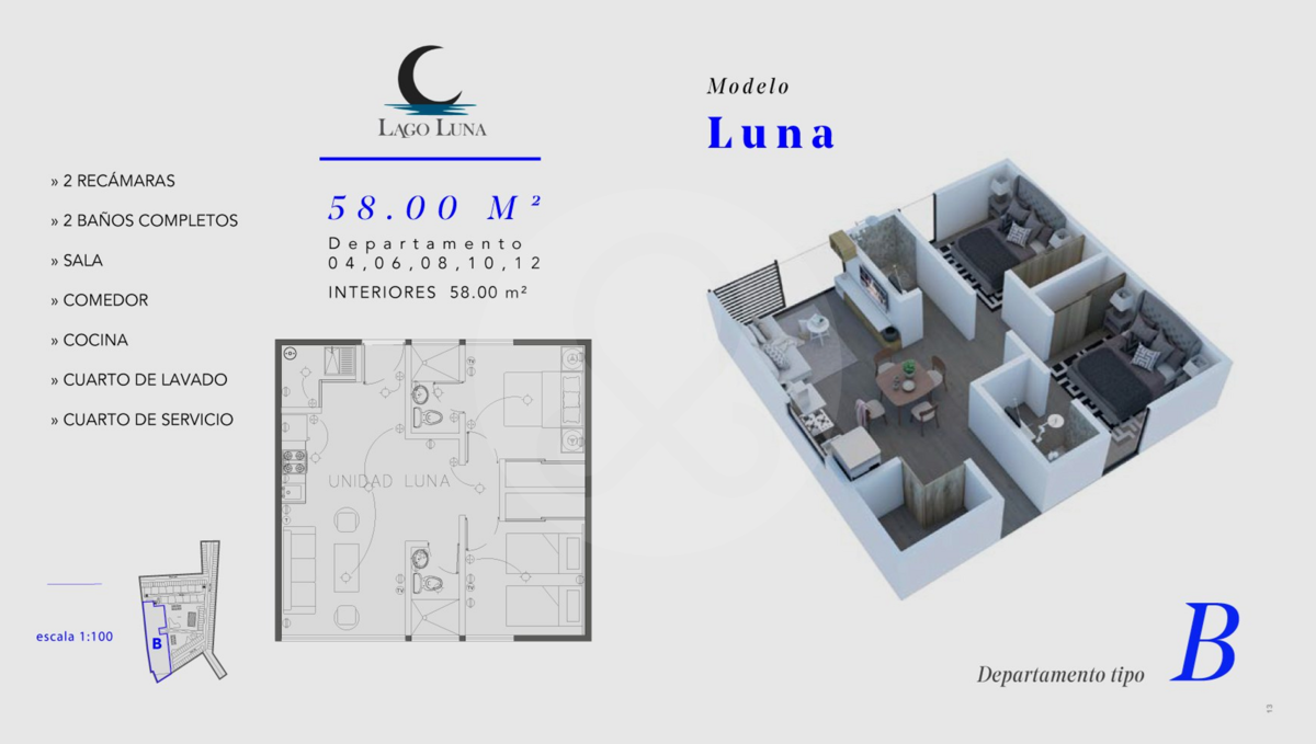 Este departamento de 2 recámaras y 2 baños completos se ubica en el cuarto y último piso del exclusivo desarrollo Lago Luna, en el fraccionamiento Playas del Chante, municipio de Jocotepec, Jalisco.