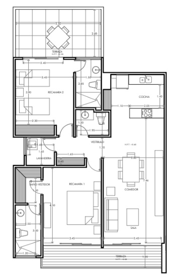 Departamento con Cocina equipada · Refrigerador · Estufa con campana · Horno microondas · Cubiertas de granito en cocina · Mesetas de mármol en baños · AC · Calentador de agua · Clósets y ventiladores.