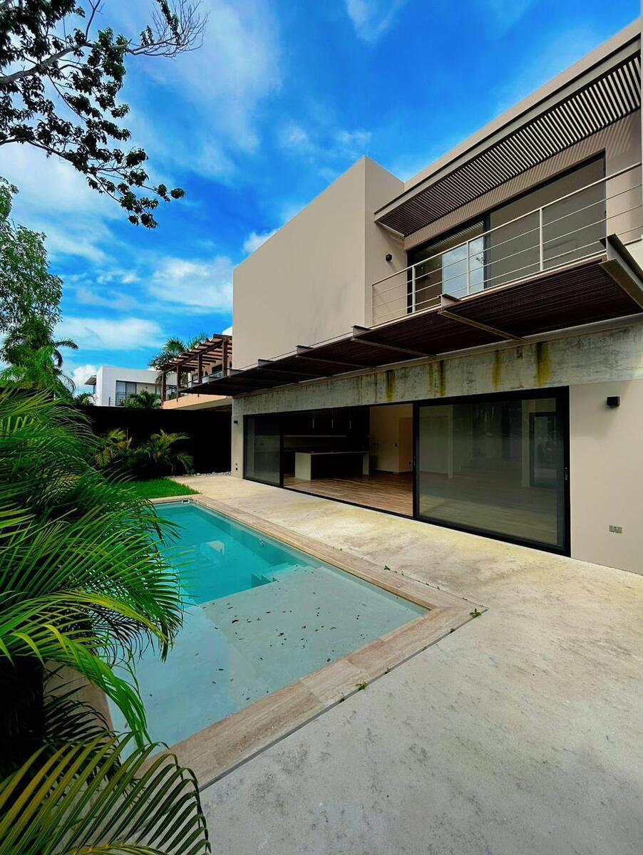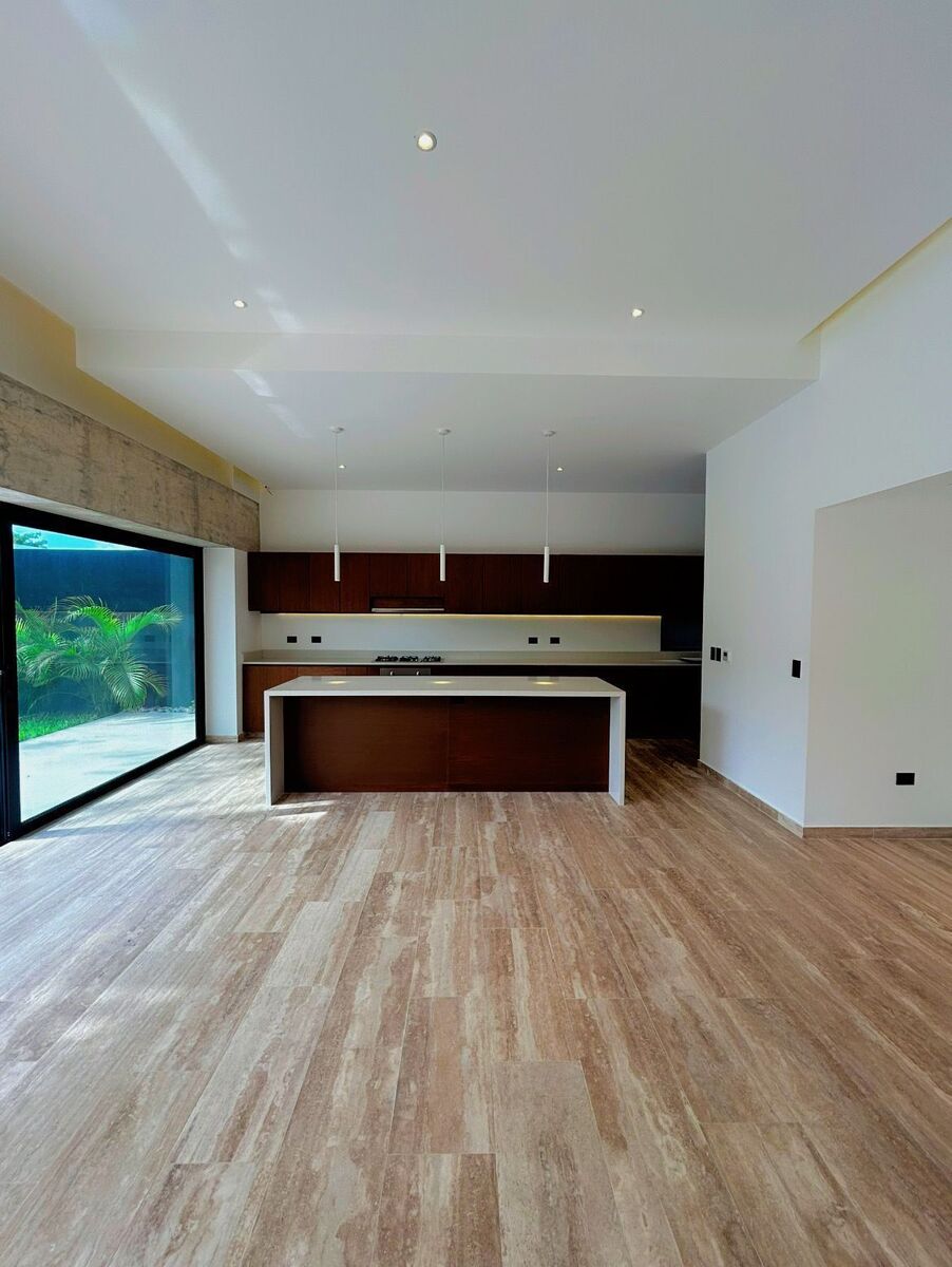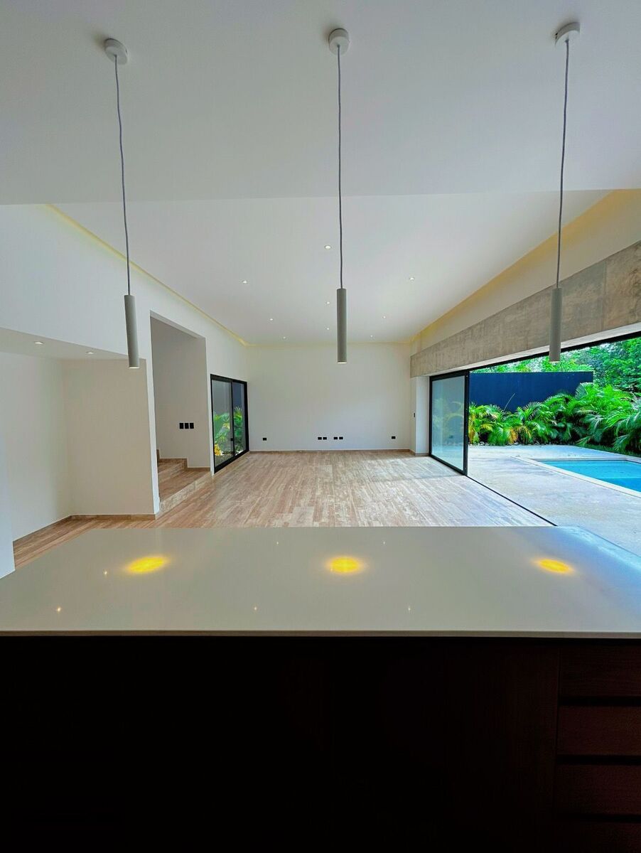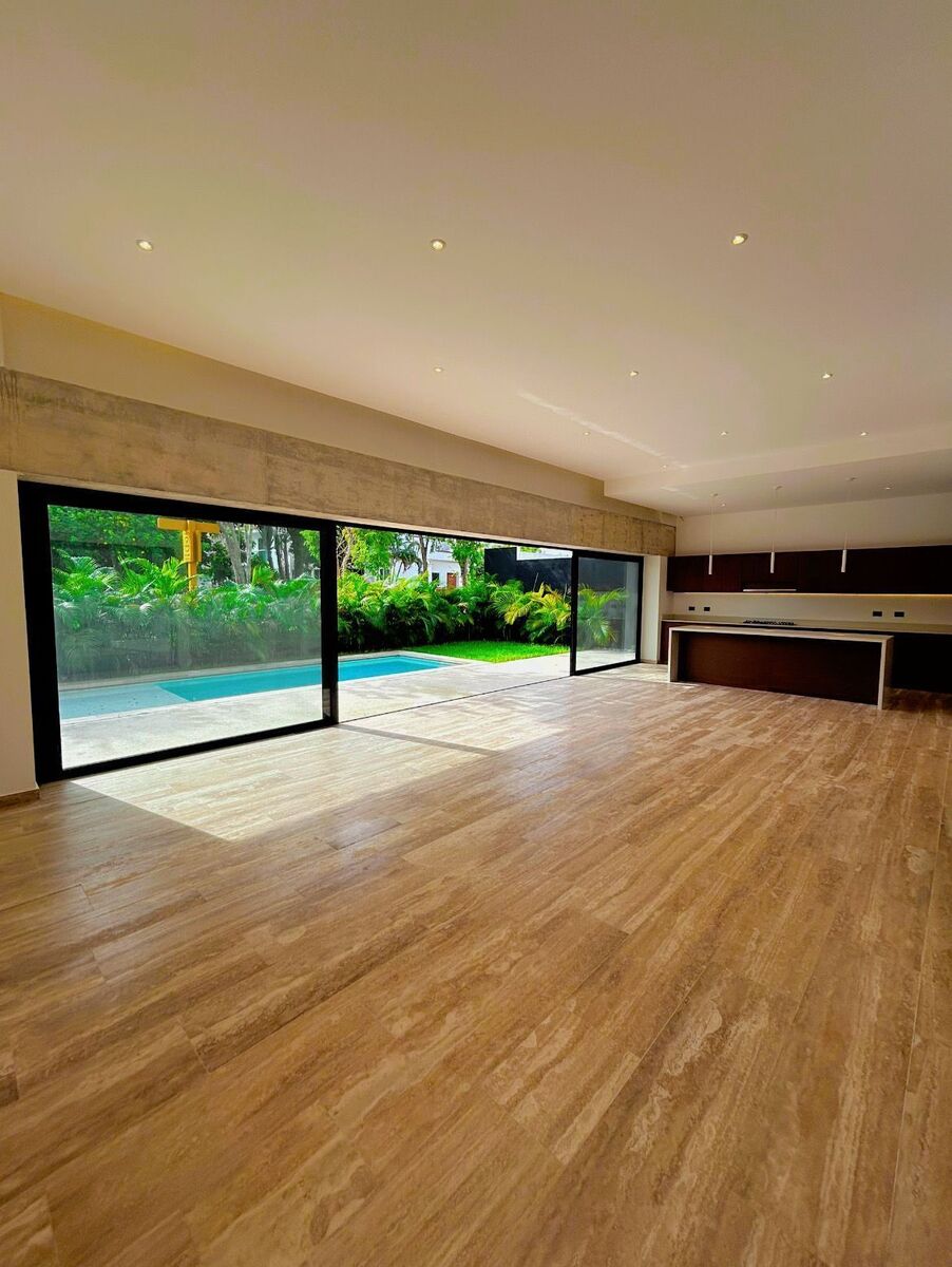 Casa de dos niveles con áreas verdes, terrazas de convivio. Una estancia con vista a la alberca y jardines, con cocina abierta y amplios espacios de estancia.