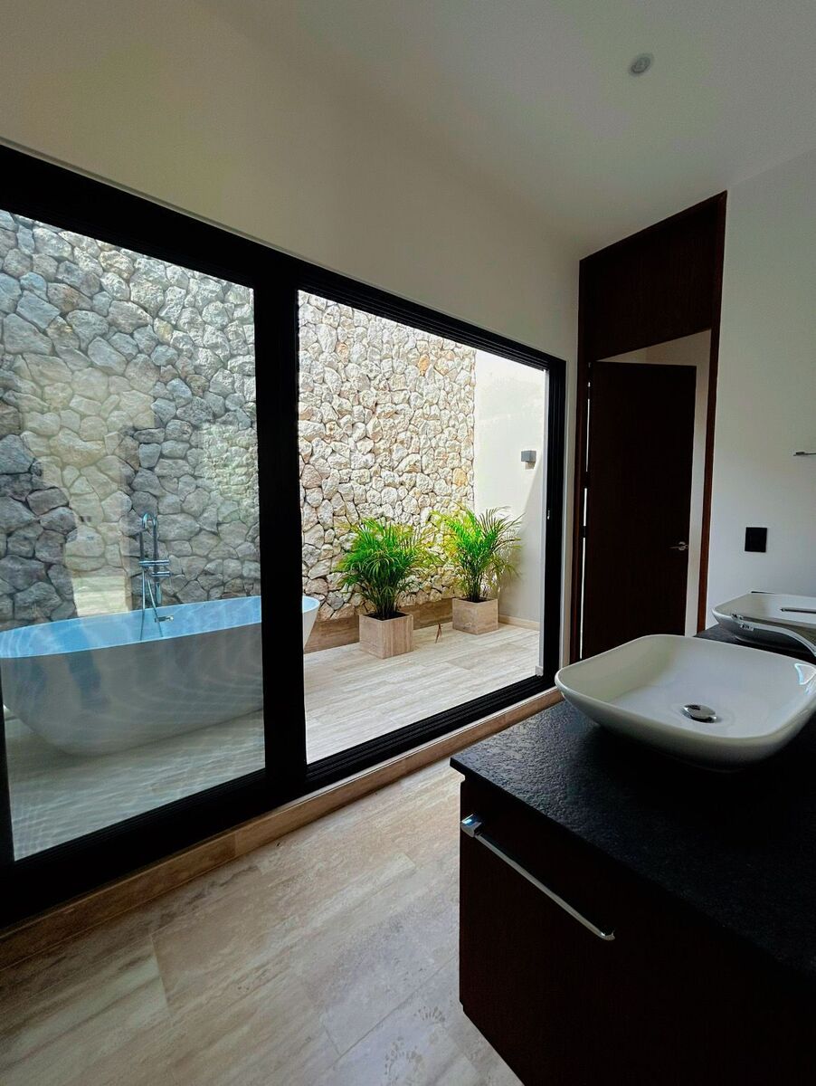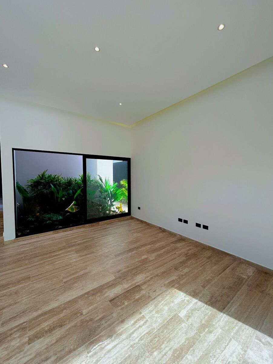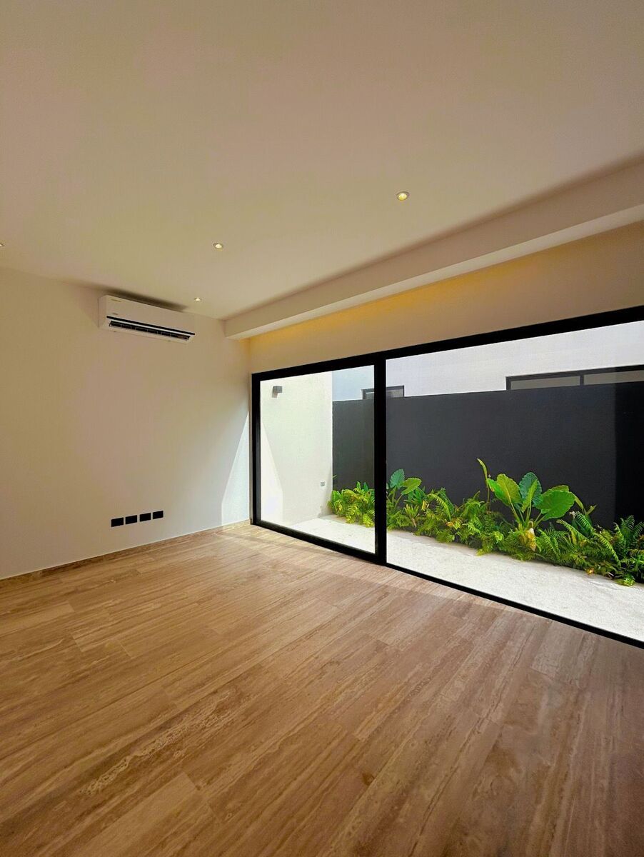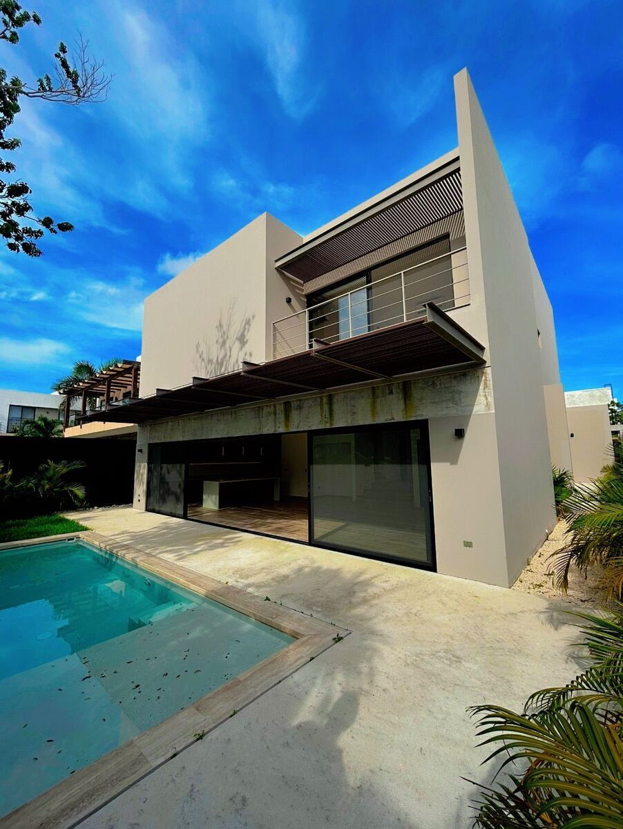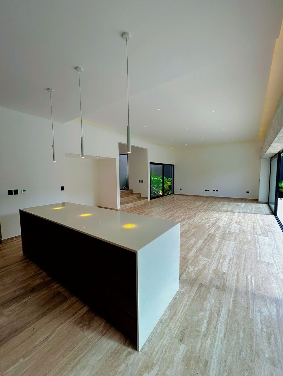 Casa de dos niveles con áreas verdes, terrazas de convivio. Una estancia con vista a la alberca y jardines, con cocina abierta y amplios espacios de estancia.