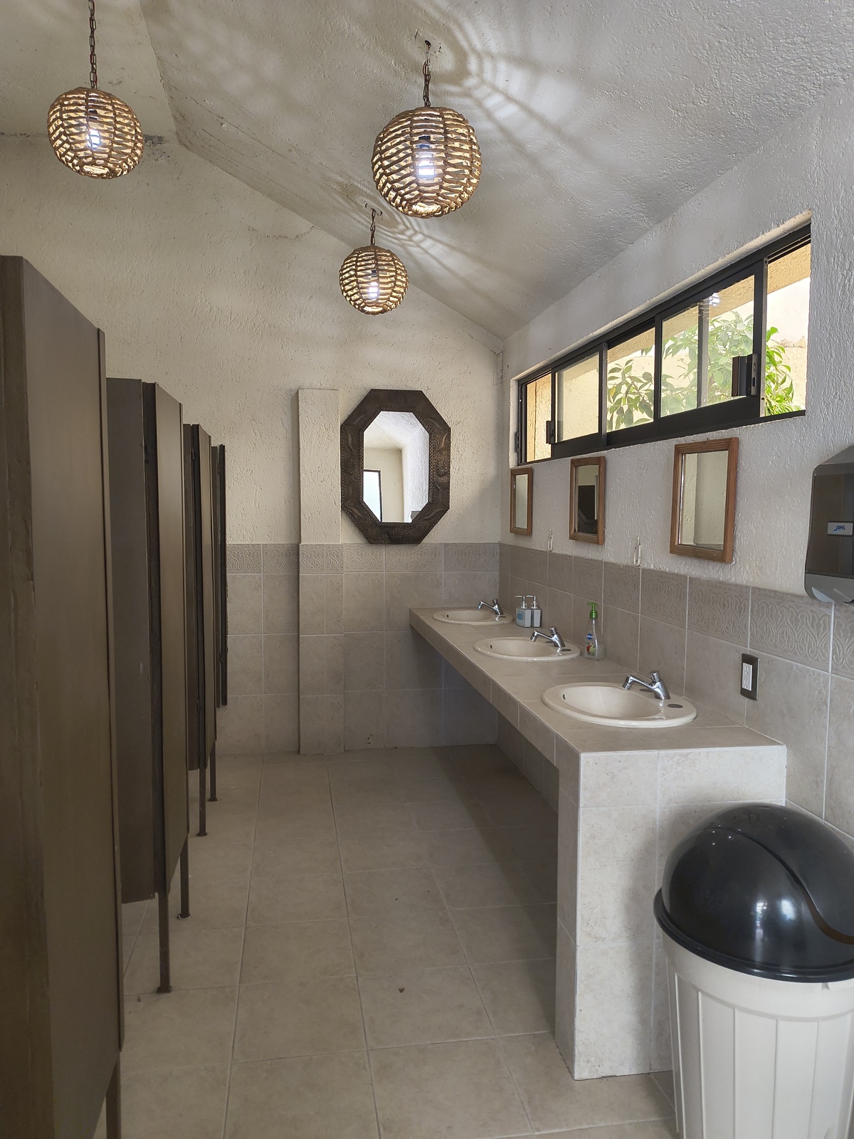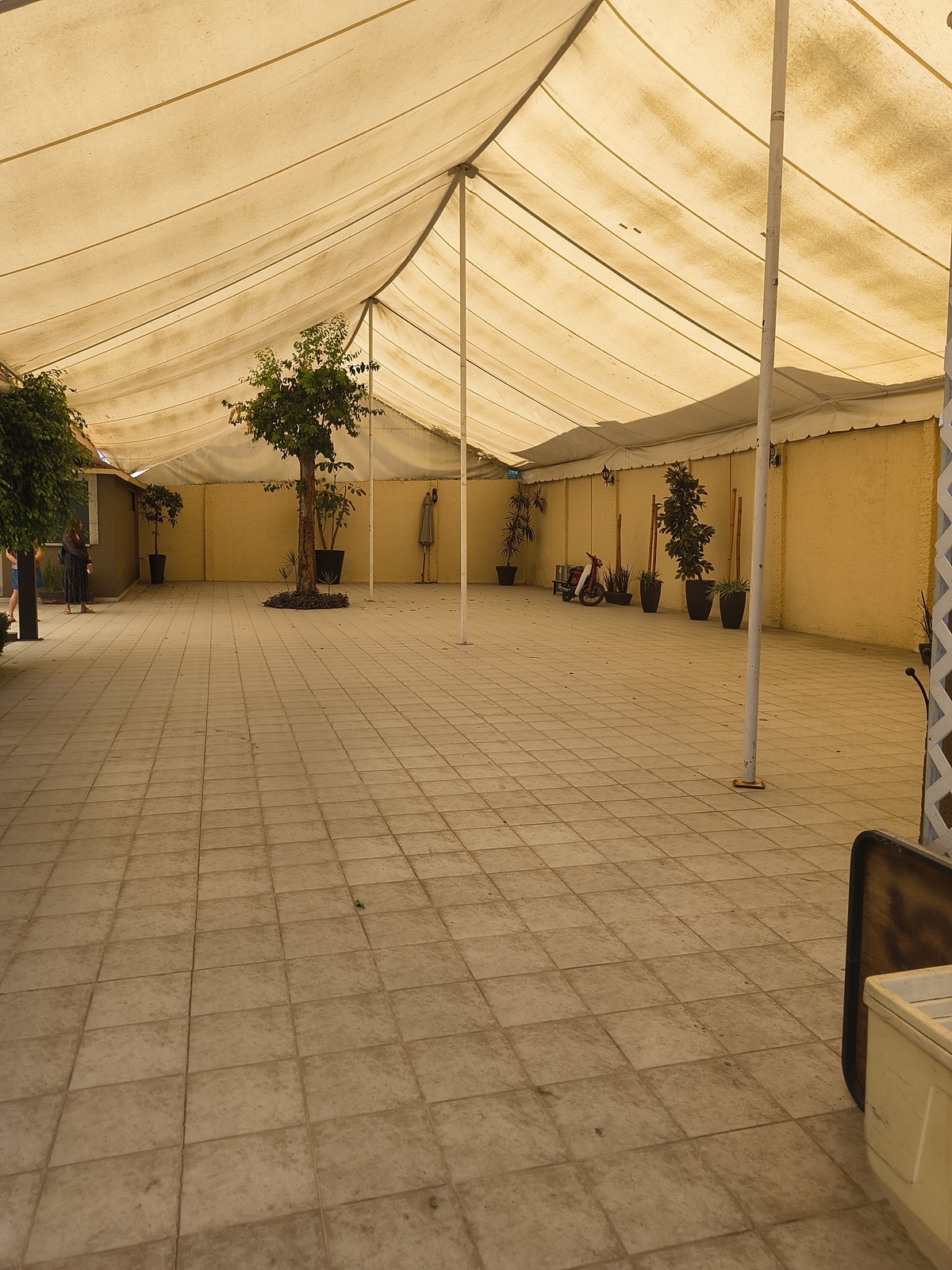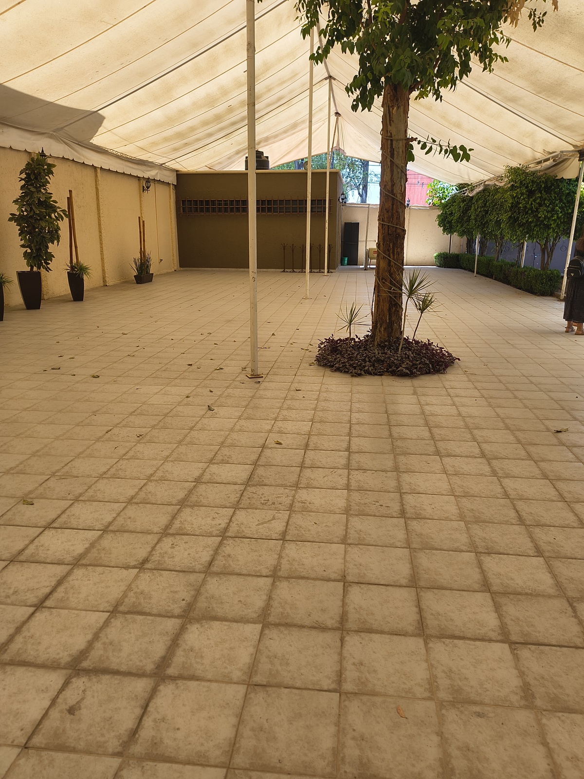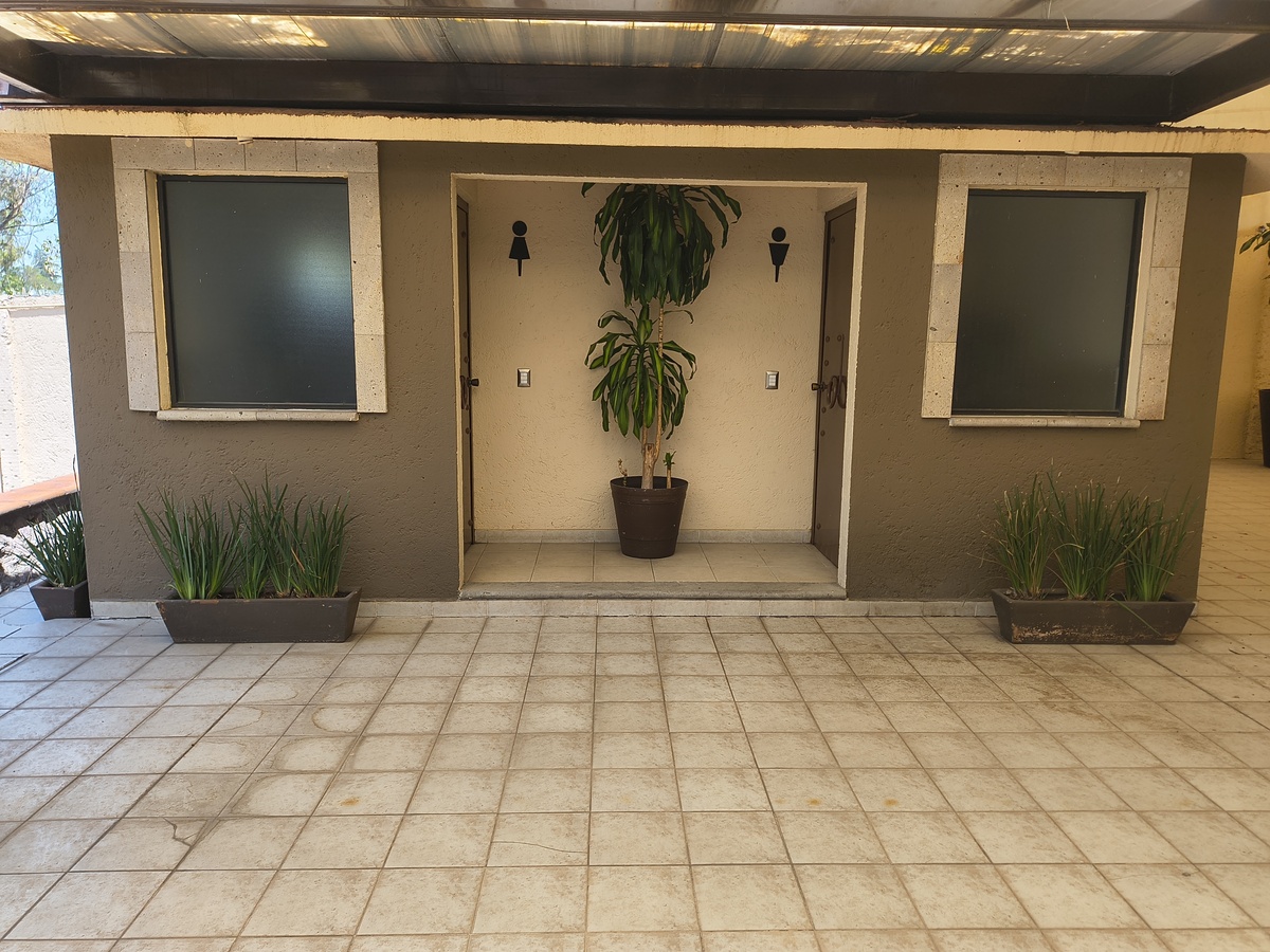 Jardín de 1,100 metros y área techada de estructura de herrería y lona, con área de cocina independiente que da servicio al salón de eventos y baños, divididos de dama y caballero (4c/u9. Cuenta con bodega independiente y oficina.