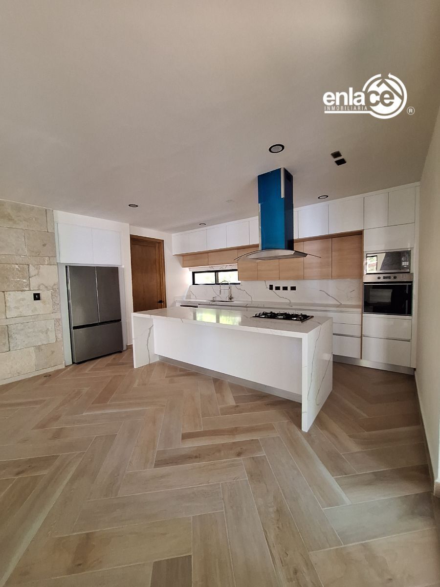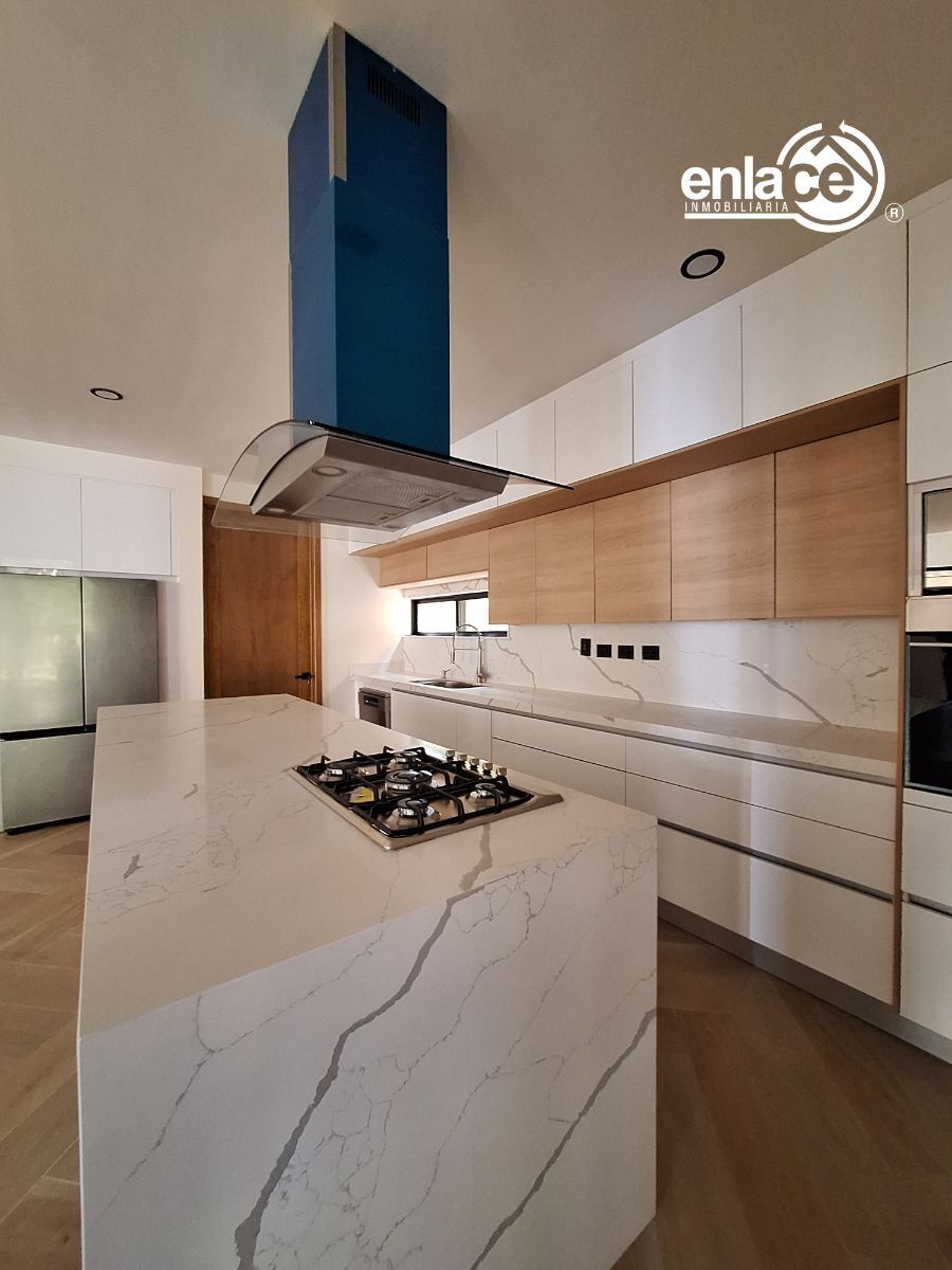 - Cocina de cuarzo blanco, diseño vanguardista con isla, barra desayunador y torre de hornos.