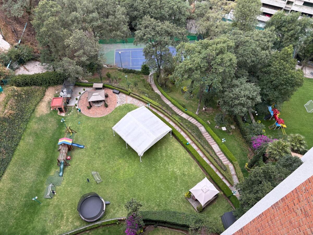 El desarrollo cuenta con jardín con asadores, alberca techada, jacuzzi, gimnasio, cancha de tenis, salón de fiestas, vigilancia y estacionamiento para visitas.