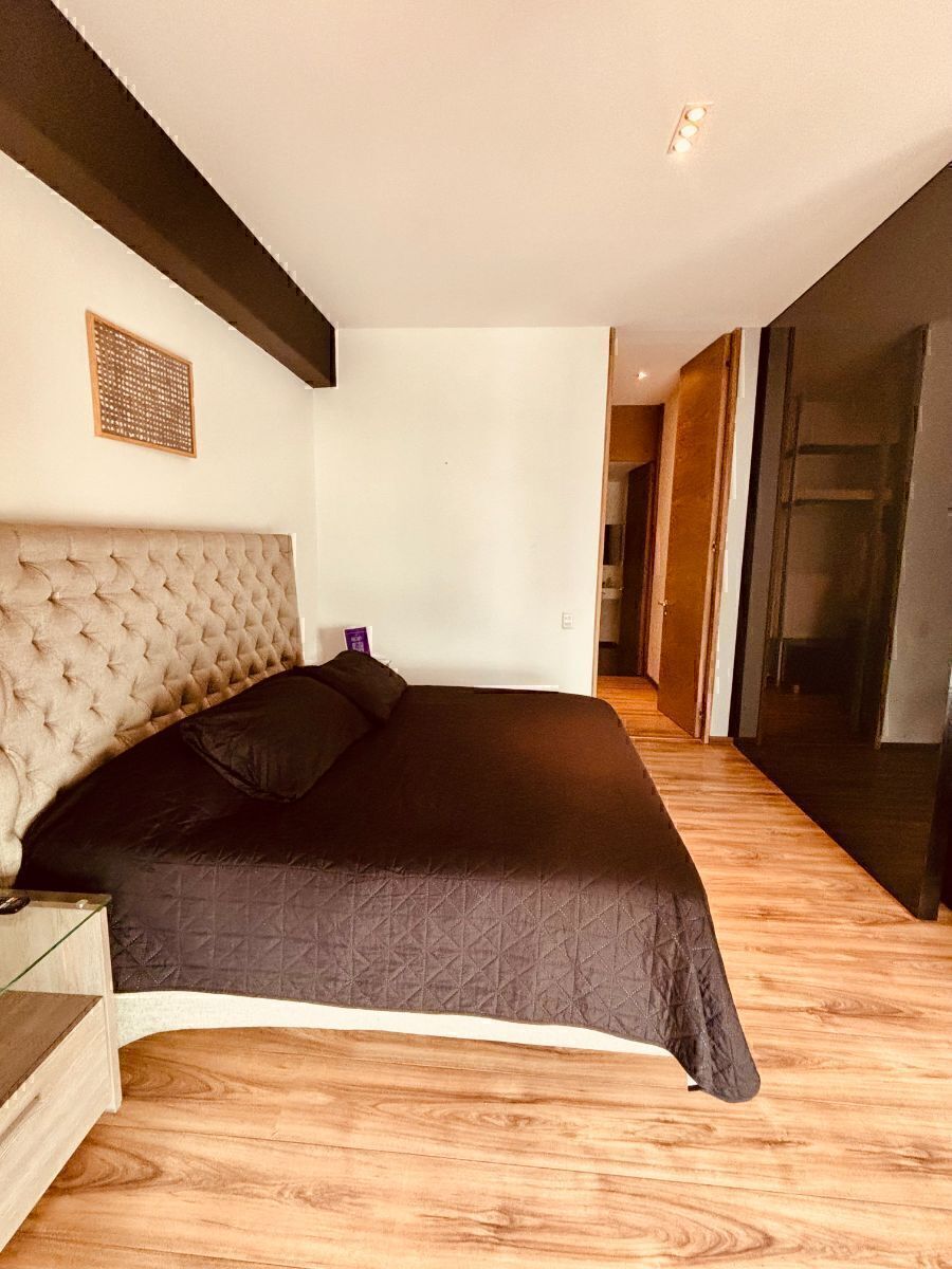 "Residencial Magenta". Super ubicado en el centro financiero de la Ciudad de México, cerca de plazas comerciales, bares, restaurantes, con excelentes vías de comunicación y a 2 cuadras del Ángel de la Independencia. Const. 80 M2, doble altura en entrepiso (3.5 m), sala- comedor, cocina integral equipada, una recamara con baño completo y closet, piso de ingeniería en recamara, sala y comedor y loseta en cocina. Excelente vista al jardín interior, 1 cajón de estacionamiento. Seguridad 24 horas y CCTV. Amenidades: Gimnasio, jacuzzi y alberca, salón de fiestas y jardín común. Tienes que verlo! Agenda tu cita ya!