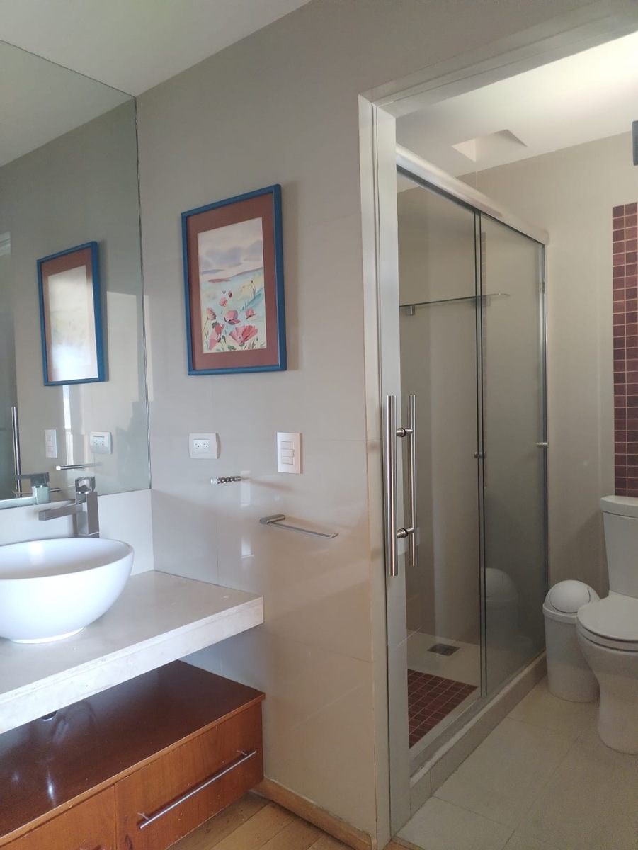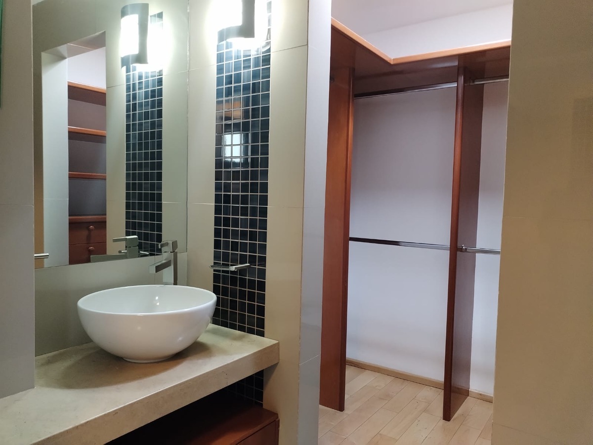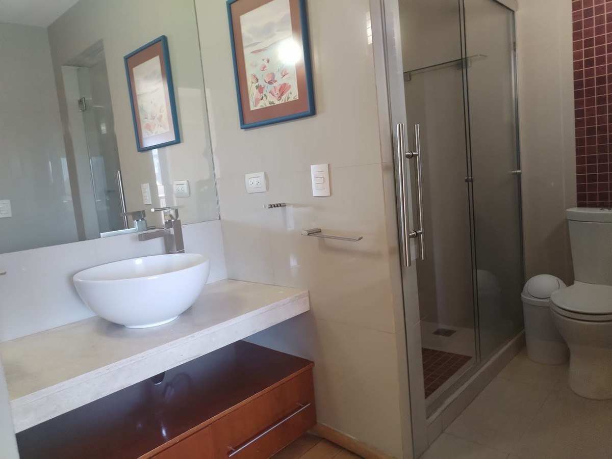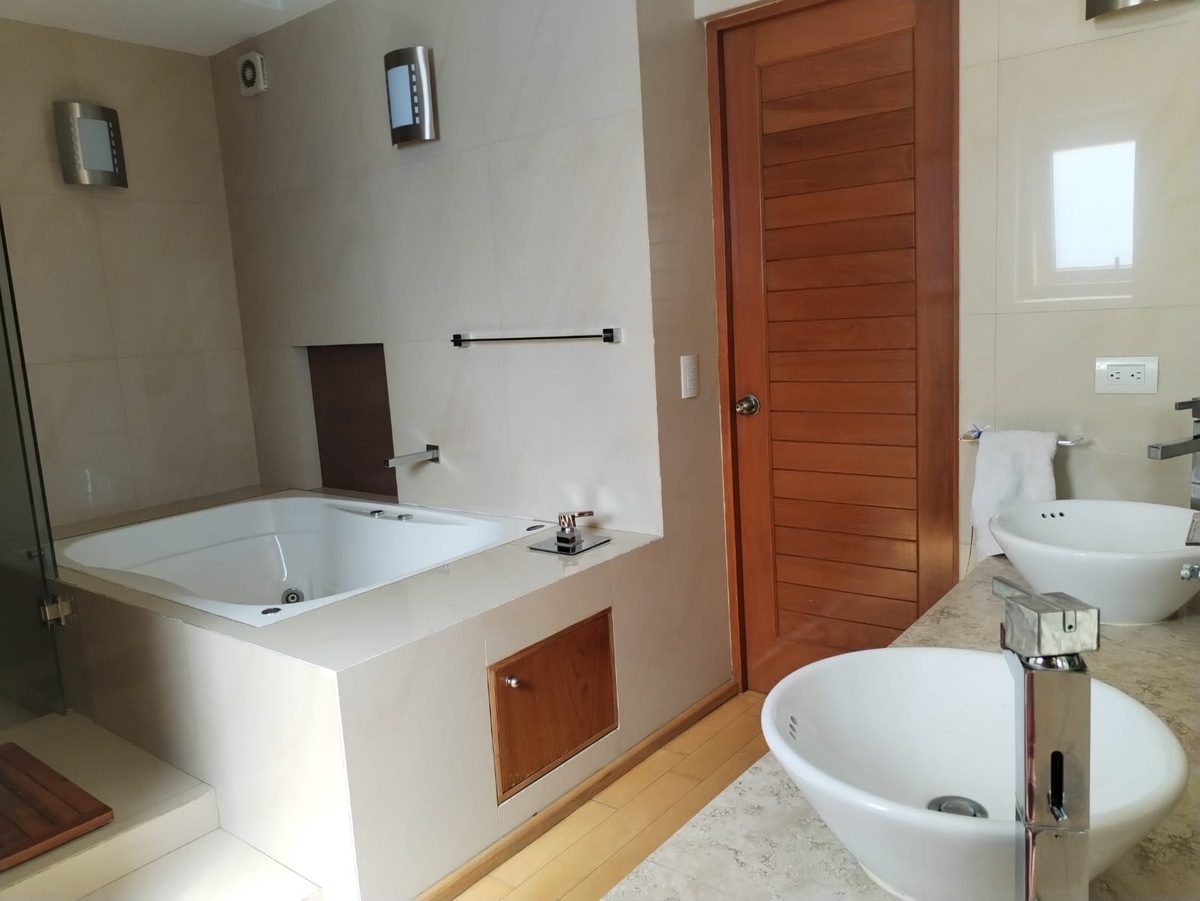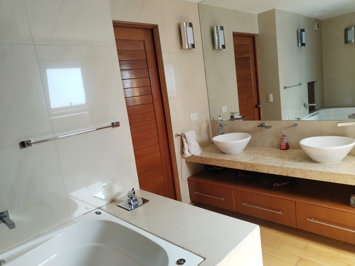 Sala , comedor , cocina equipada ,medio baño de servicio, cuarto de servicio , área de lavado ,tres recámaras cada una con baño , la principal con tina , tres cajones de estacionamiento .