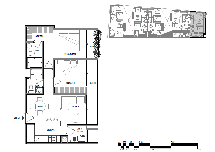 El desarrollo cuenta con 25 departamentos distribuidos en 5 niveles (PB + 4).