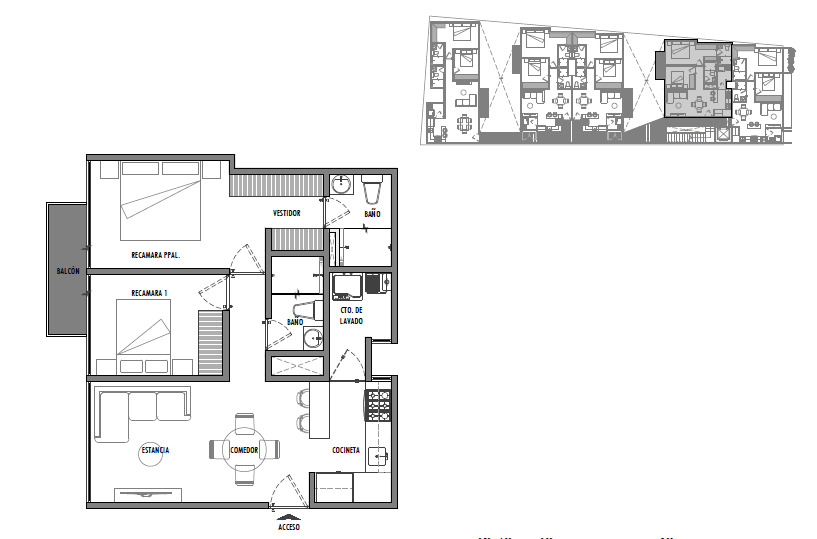 El Departamento 302 de tipología interior tiene un Área Habitacional de 66.05M2 + Área de Balcón de 3.3M2 = Área Total de 69.35M2.