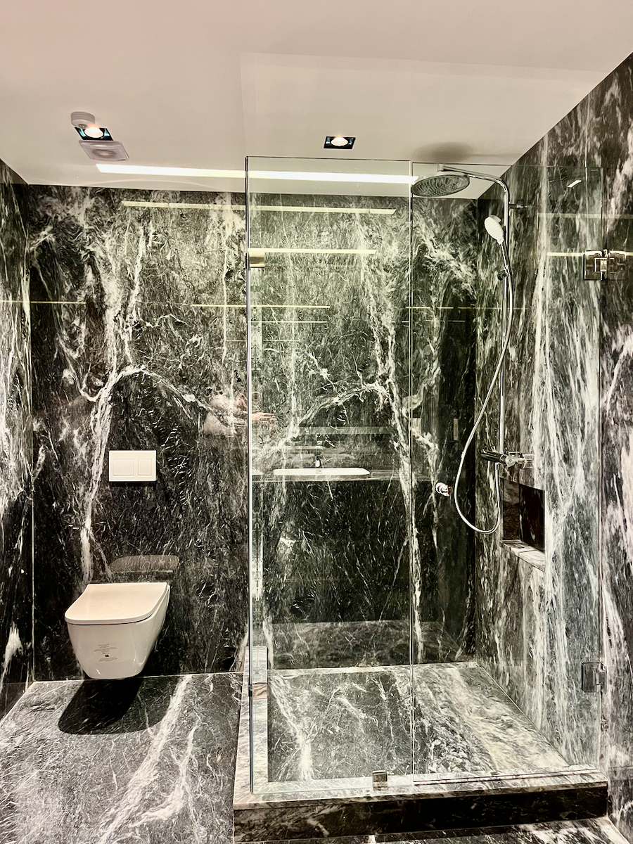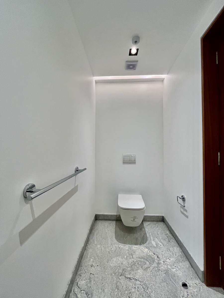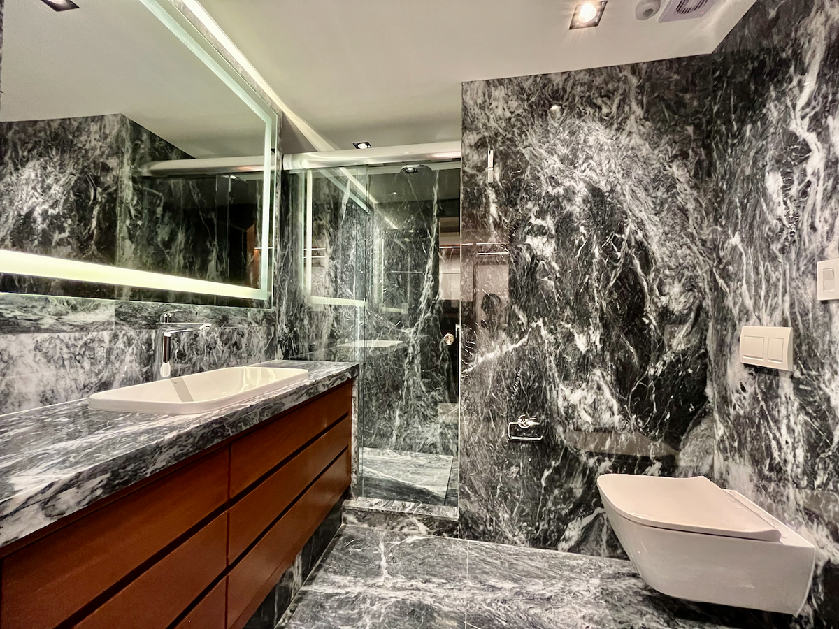 La cocina cerrada, completamente revestida en mármol. Además, el baño de visitas, también con acabados en mármol, agrega un toque de sofisticación adicional.