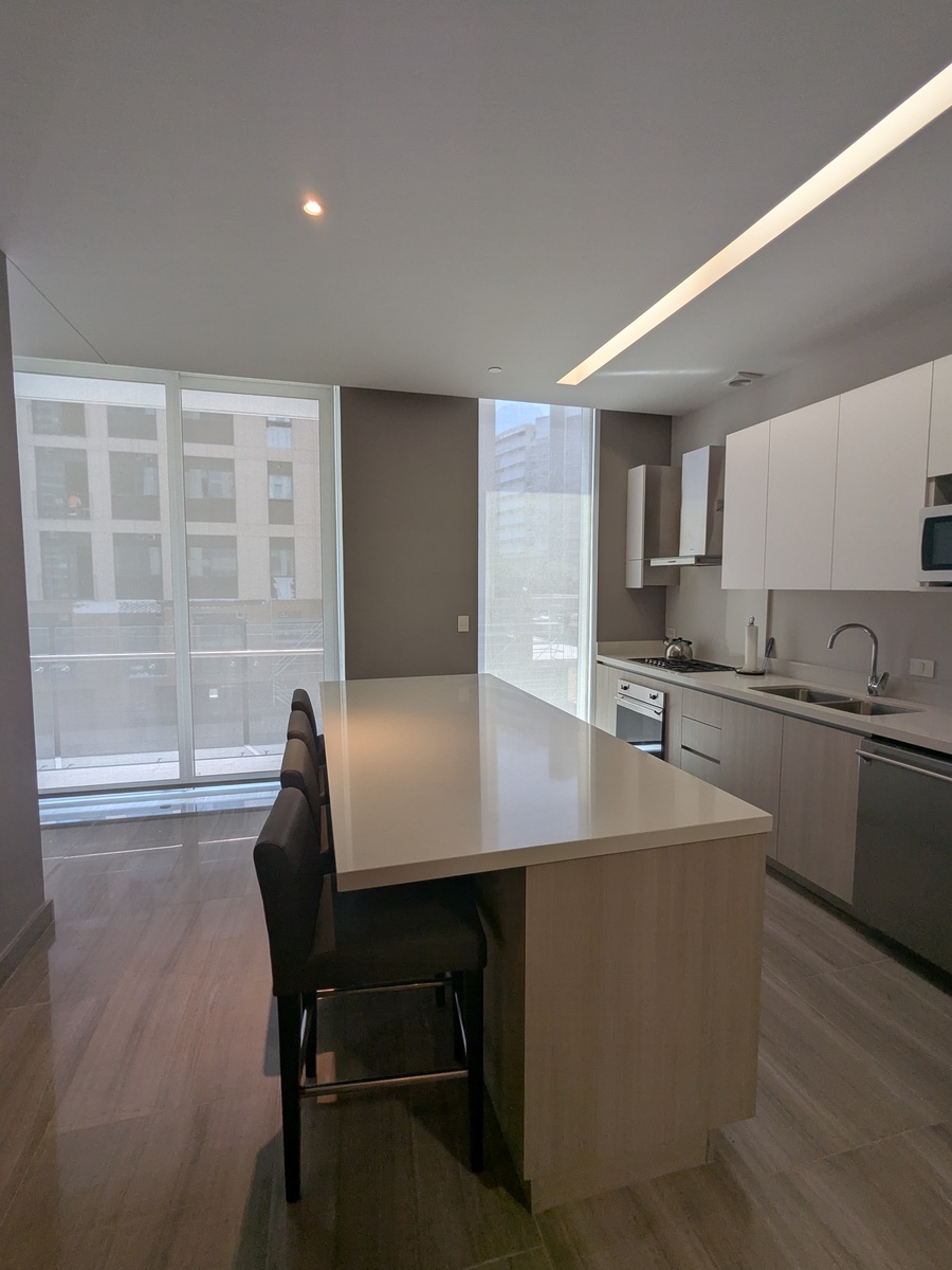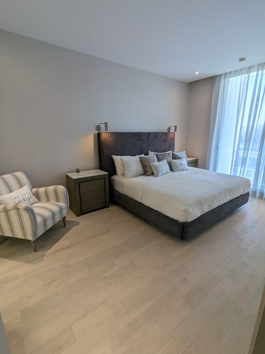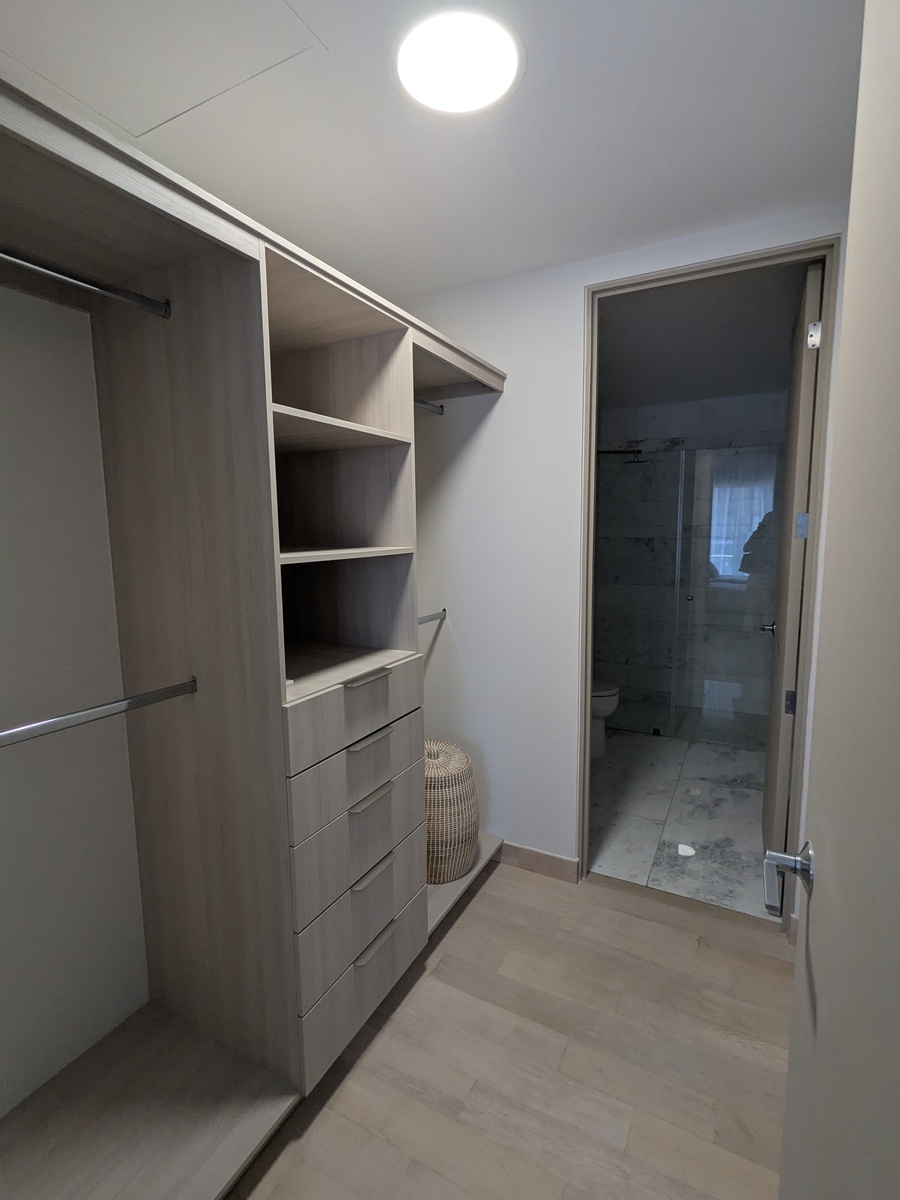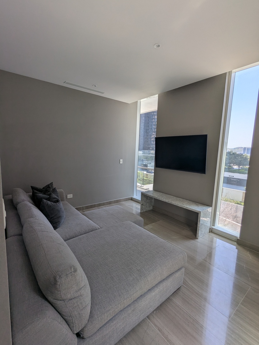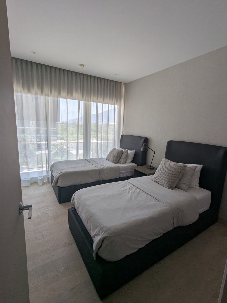 Dos recámaras, cada una con su walk-in closet y baño. Cocina, sala de TV, comedor, baño de visitas, lavandería, cuarto de servicio. Balcones con hermosas vistas