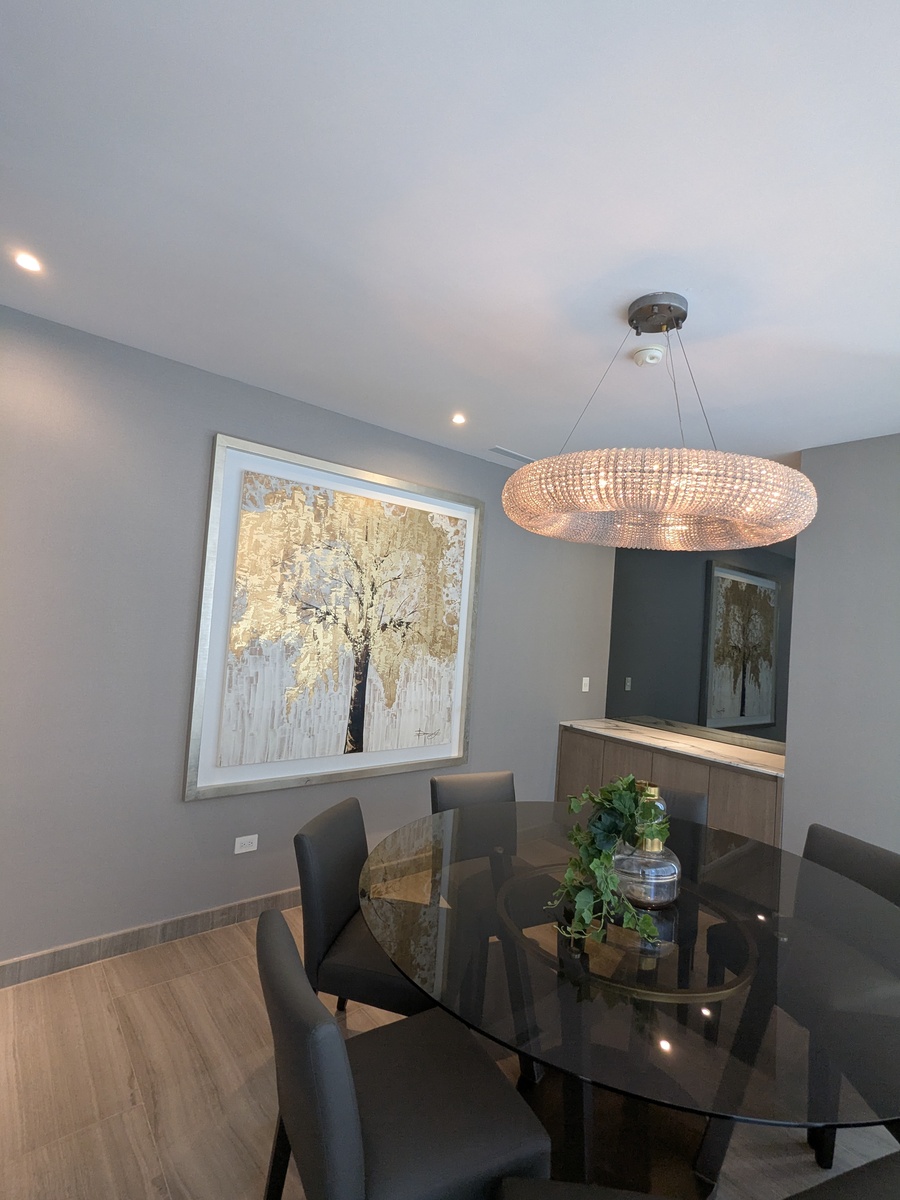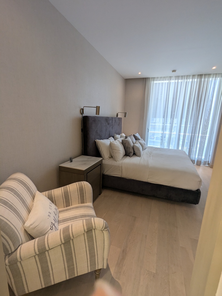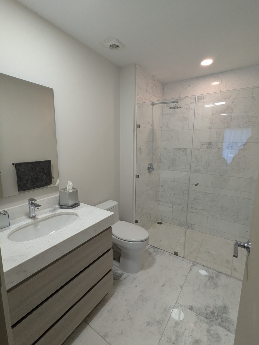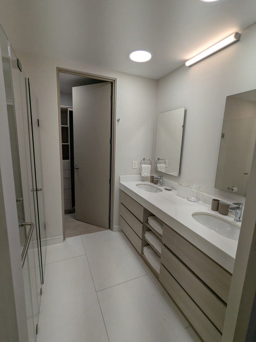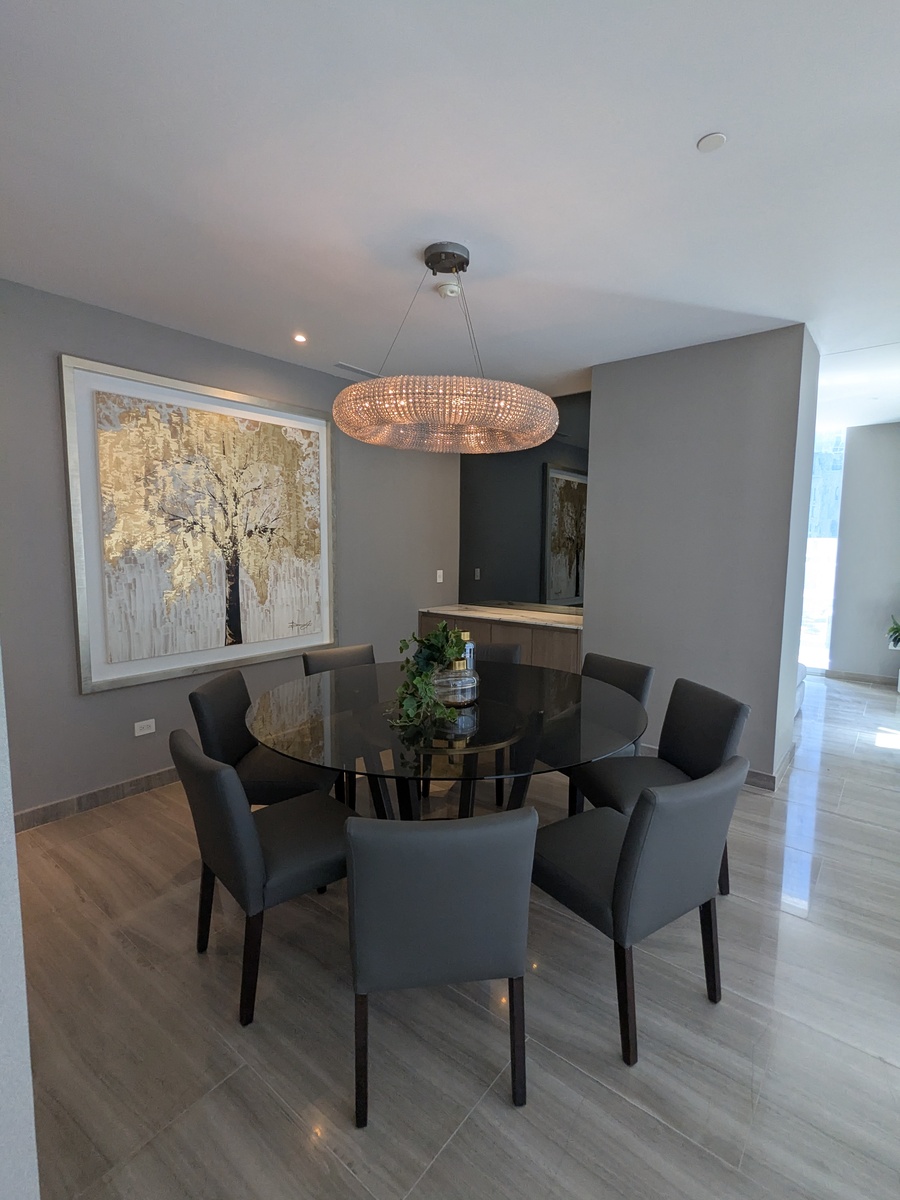 Dos recámaras, cada una con su walk-in closet y baño. Cocina, sala de TV, comedor, baño de visitas, lavandería, cuarto de servicio. Balcones con hermosas vistas