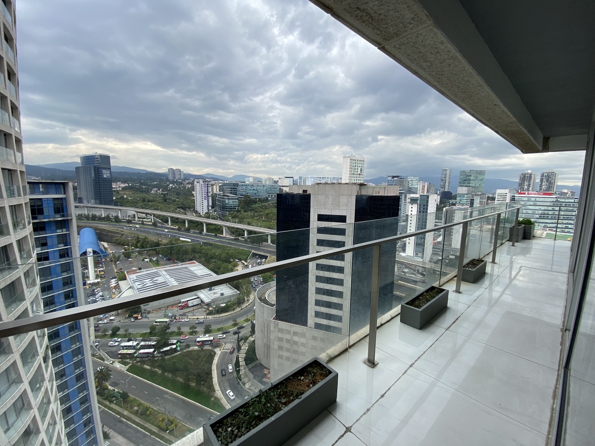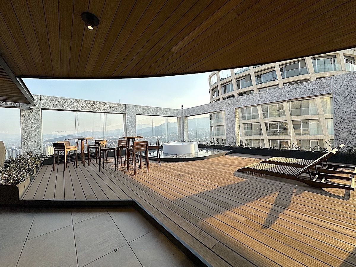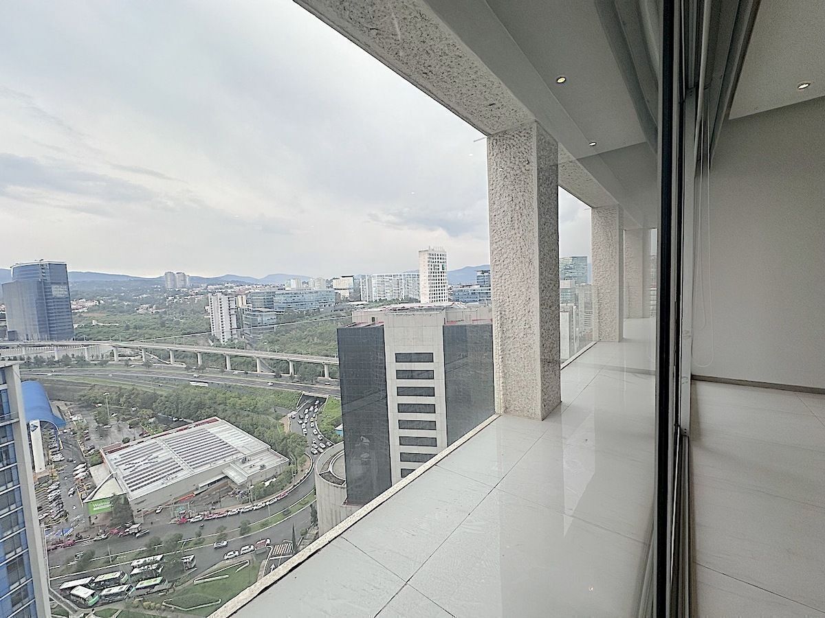 Este apartamento mide 115 Mts2 se encuentra en la emblemática Torre Península Tower, diseñada por el Arq. González de León, cuenta con vista al Parque de la Mexicana desde la sala comedor y a Av. Santa Fe y la Ciudad desde las 2 recámaras, goza la privilegiada ubicación y el bienestar de vivir en avenida Santa Fe, es la avenida más segura de la CDMX y tiene a pie de calle prestigiosos colegios y universidades, grandes centros comerciales con todos los servicios, restaurantes y cafés de moda, empresas internacionales, hospitales reconocidos, el Parque de la Mexicana, etc.