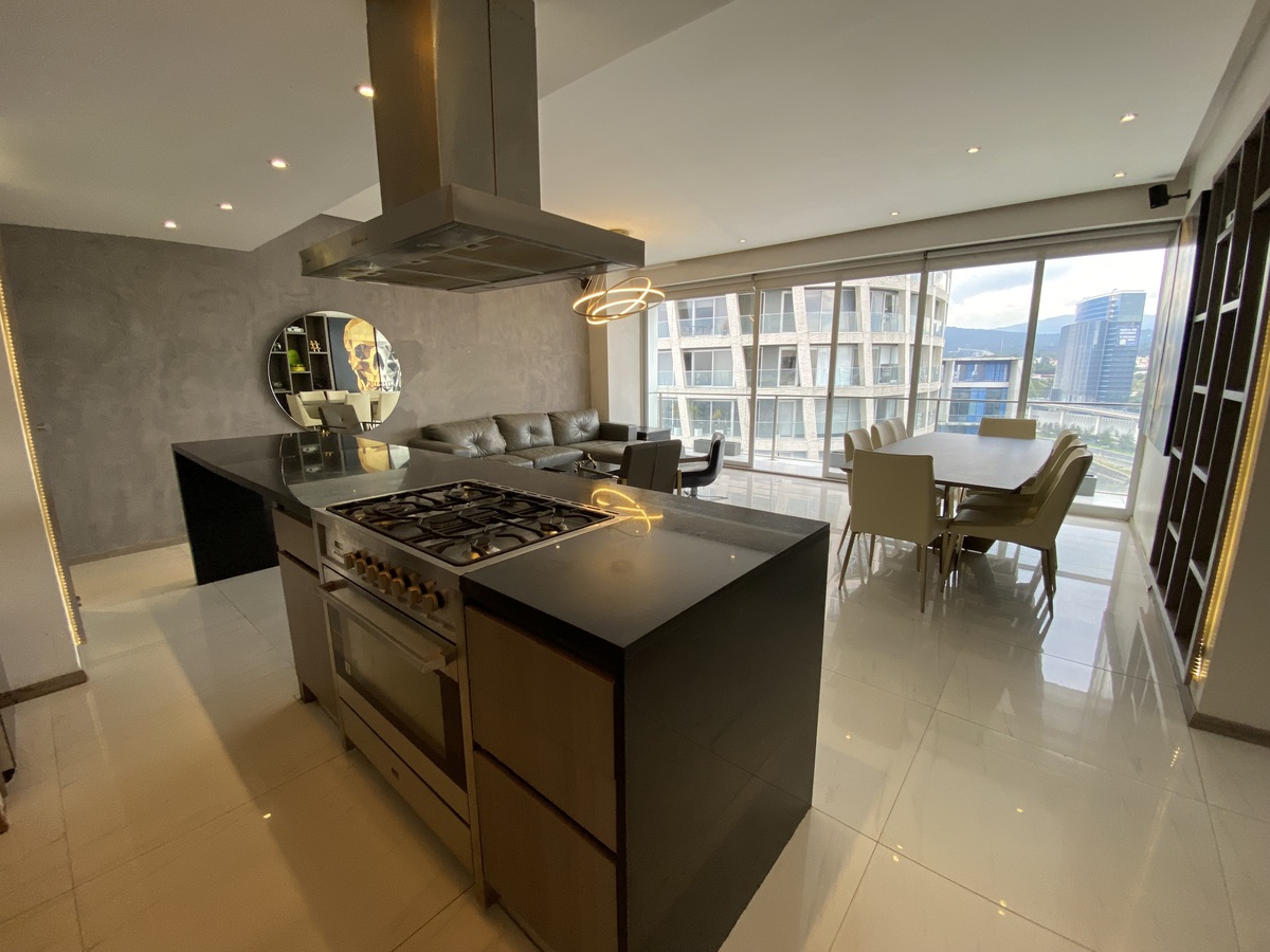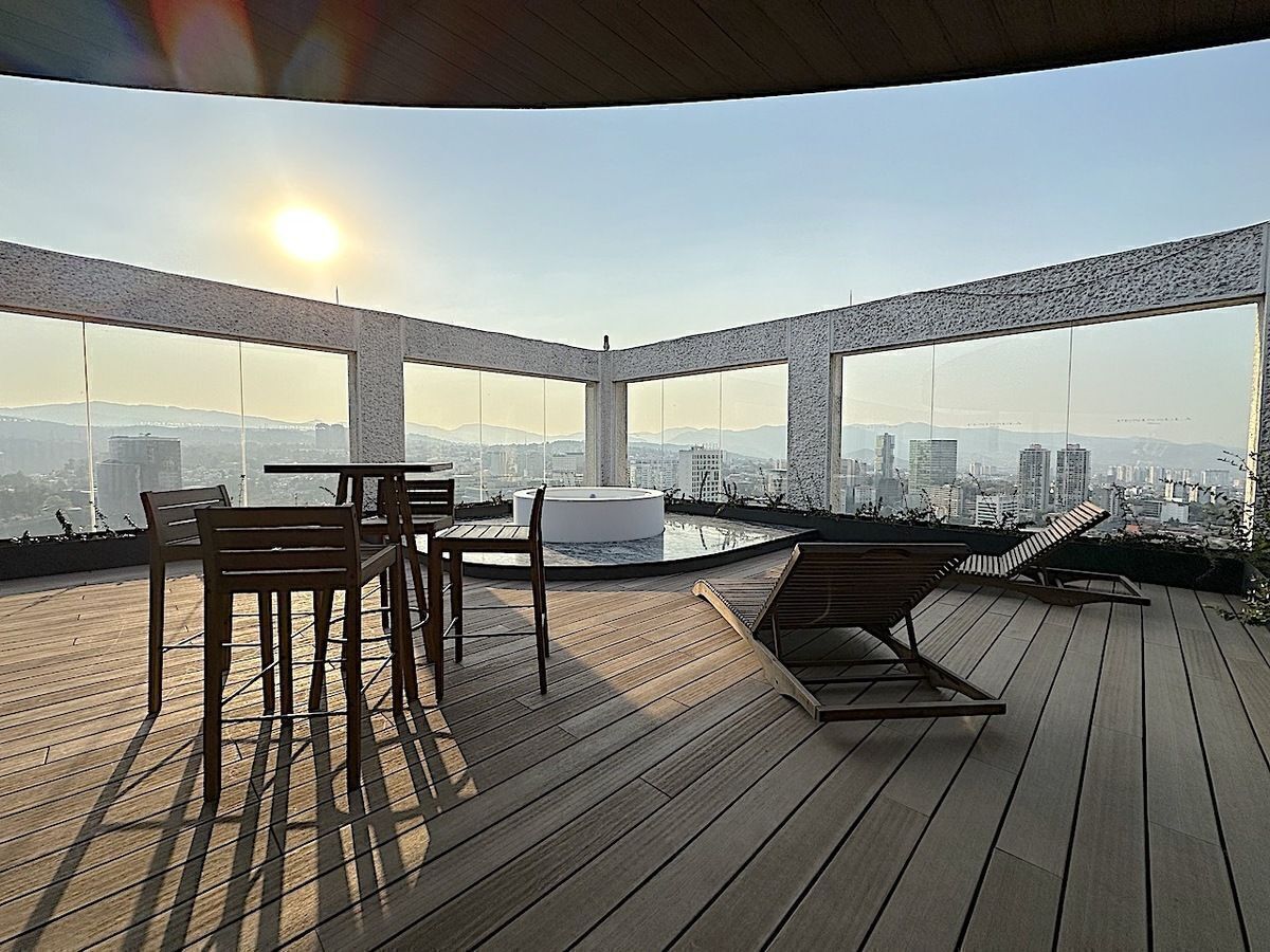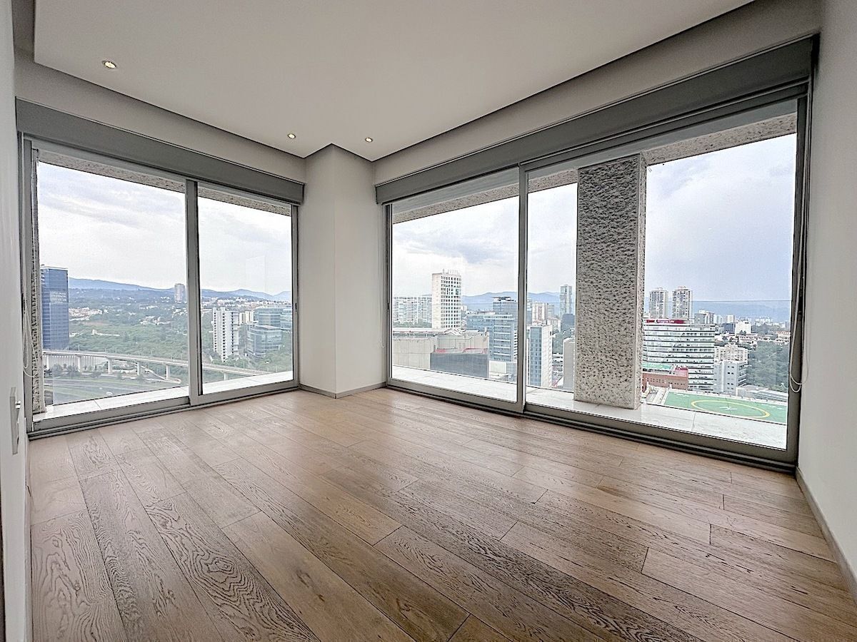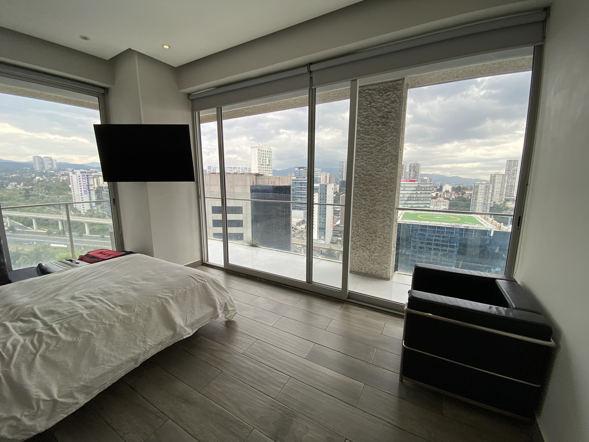 Este apartamento mide 115 Mts2 se encuentra en la emblemática Torre Península Tower, diseñada por el Arq. González de León, cuenta con vista al Parque de la Mexicana desde la sala comedor y a Av. Santa Fe y la Ciudad desde las 2 recámaras, goza la privilegiada ubicación y el bienestar de vivir en avenida Santa Fe, es la avenida más segura de la CDMX y tiene a pie de calle prestigiosos colegios y universidades, grandes centros comerciales con todos los servicios, restaurantes y cafés de moda, empresas internacionales, hospitales reconocidos, el Parque de la Mexicana, etc.